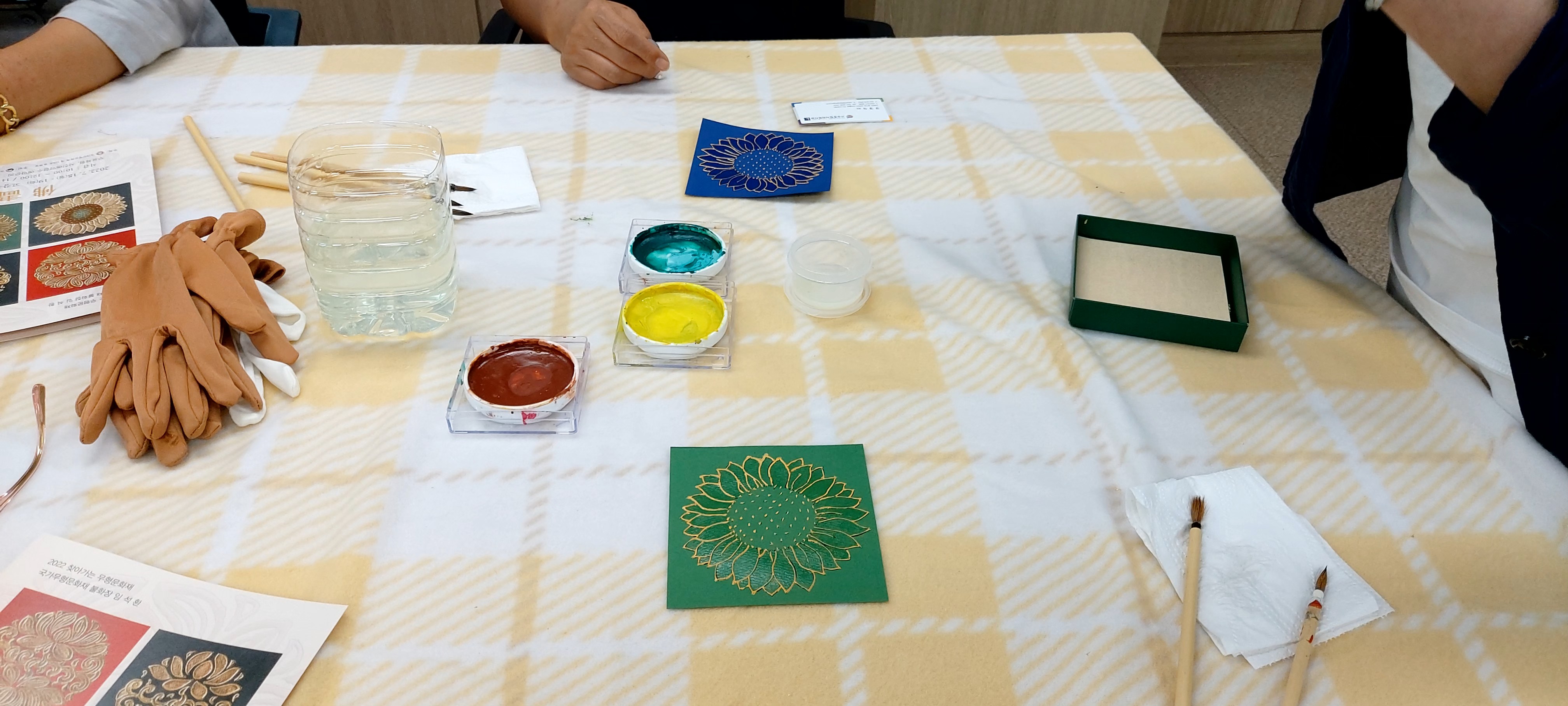 주어진 문양에 붓으로 풀과 같은 것을 바르고 금박을 두르는데