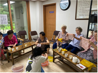 아이들과 어르신이 짝이 되어 프로그램을 진행하는 방식에서 아이들과 어르신들이 직접 손수건을 물들이고 편지를 작성해 교환하며 세대 교류를 이루는 것으로 진행하게 되었습니다.