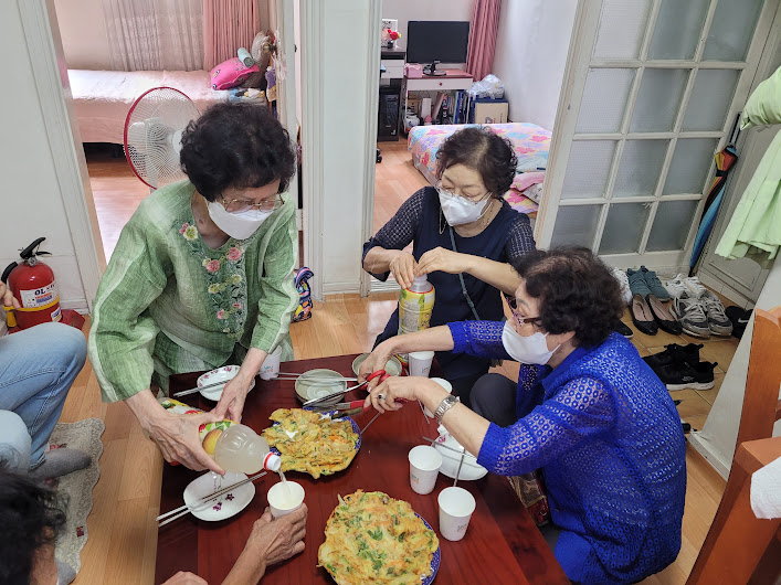 모두 한 마음으로 준비한 덕분에 금세 상이 차려졌습니다. 네모난 상 주변으로 둘러앉아 함께 김치전 먹으며 도란도란 이야기 꽃이 피었습니다.