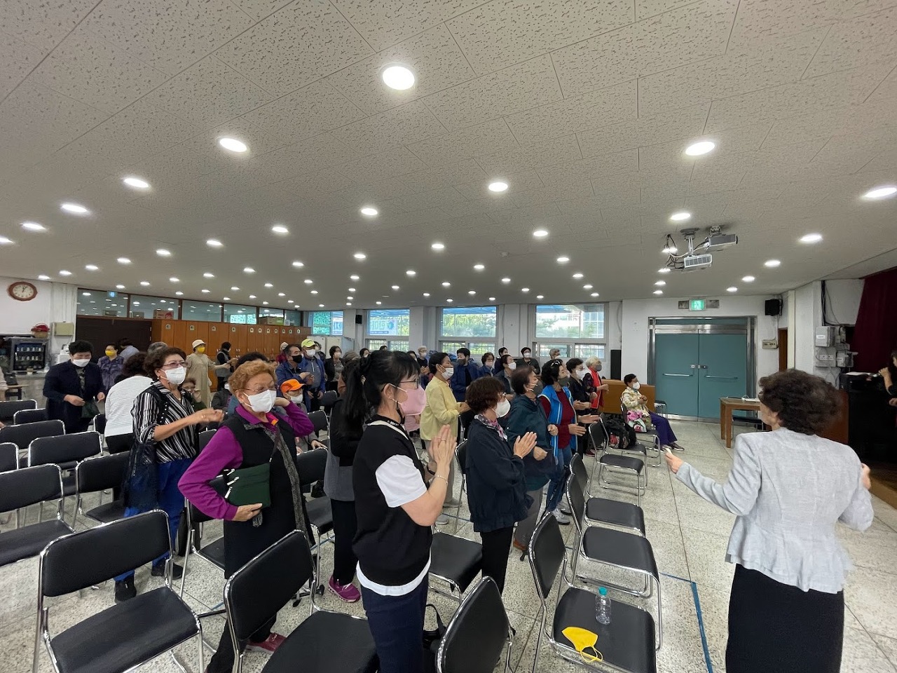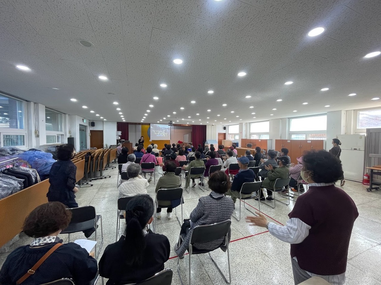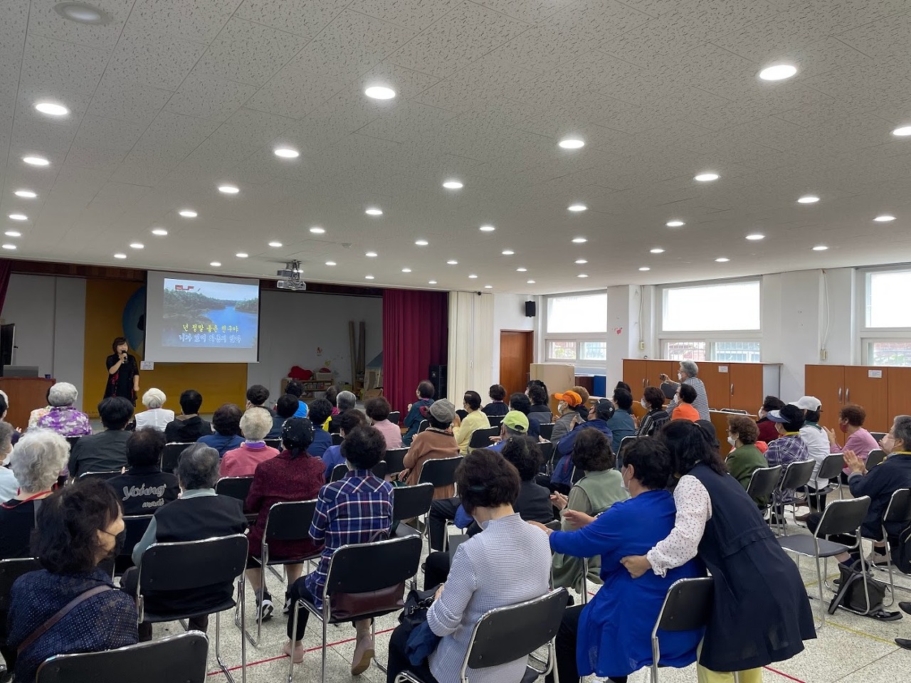 잠시 쉬는 시간을 가진 뒤 함유혜 강사님이 진행하는 노래교실이 이어집니다. 고강동에 맞춘 가사를 준비해 오신 강사님의 센스와 재미난 입담 덕에 곳곳에서 노래를 따라 부르는 소리와 함께 어르신들의 웃음이 계속됩니다. 어르신들의 적극적인 반응에 강사님도 즐거우셨는지 예정된 시간을 넘겨서 진행된 노래교실. 강사님의 마무리 인사에 아쉬워하는 어르신들. 앞으로의 수업에 대한 기대감을 느낄 수 있었습니다.