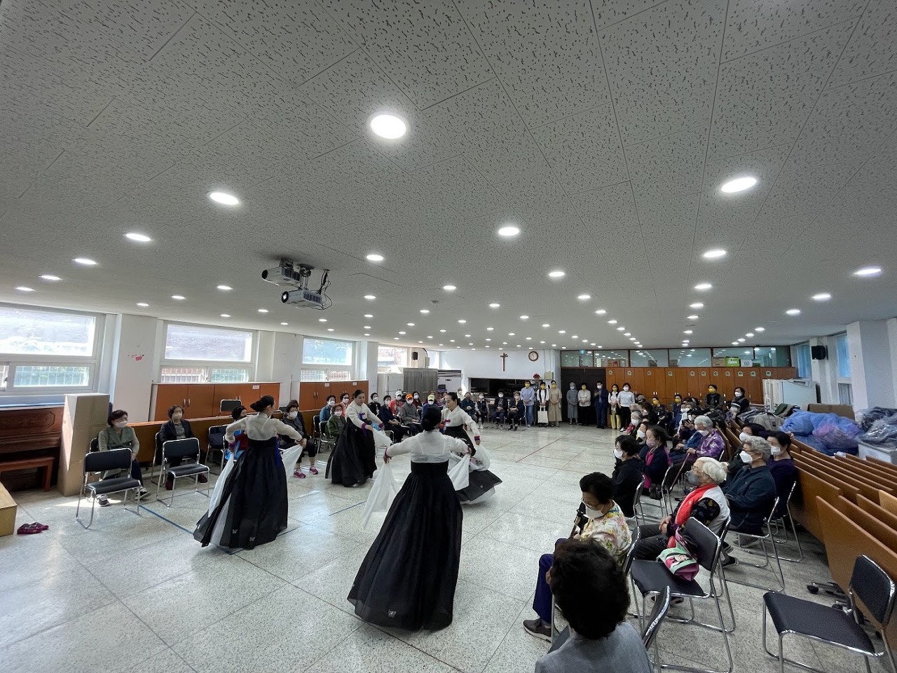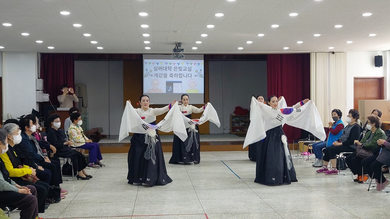 텅 비어있던 강당이 금새 가득 차 북적입니다. 신부님의 축하 말씀을 시작으로 드디어 시작된 은빛교실. 첫 시간은 앞으로 배워 갈 한국무용 공연을 감상하는 시간입니다. 오늘을 위해 무대에 오를 때 입는 의상을 챙겨 오신 노귀자 강사님과 단원 분들. 흥겨운 음악과 아름다운 음악 덕분에 공연 내내 어르신들의 박수가 이어졌습니다.