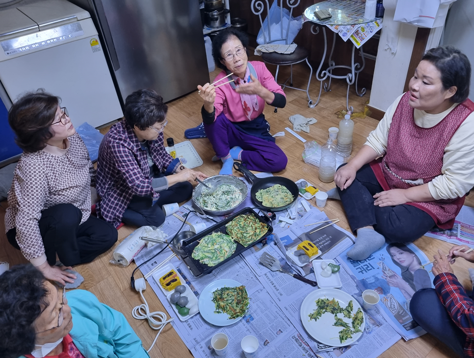 전을 다 부치고 어르신들과 함께 자리 앉아 자신을 소개합니다.