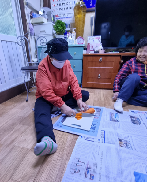 어르신들은 당근도 썰고, 부추를 자르고 반족을 합니다.
