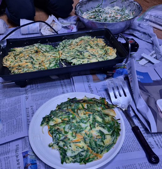 전을 다 부치고 어르신들과 함께 자리 앉아 자신을 소개합니다.