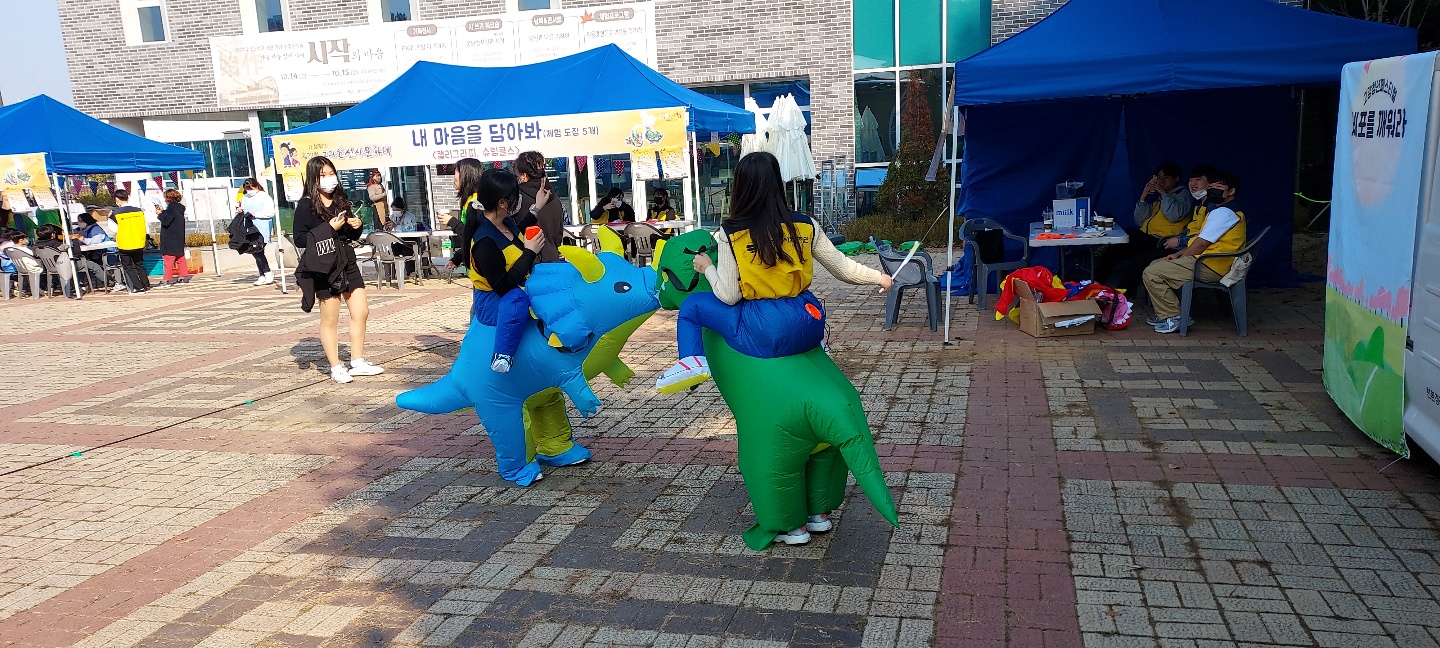 광장에서는 선사장학퀴즈, 내 마음을 담아 만들어보는 캘리그라피와 슈링클스, 공룡 옷 입고 예쁜 포토존에서 사진찍기가 있었습니다. 다른 한편에서는 에코백과 점핑클레이로 만들어보는 나는요 원시인, 무엇이든 물어보는 타로와 에니어그램 상담, 선사 집 꾸미기, 솜사탕과 음료를 직접 타 먹어 볼 수 있는 스스로 가게, 타투, 이벤트 등 참여형 공간들이 원형으로 둘러쌓여 아기자기한 재미가 있었습니다.