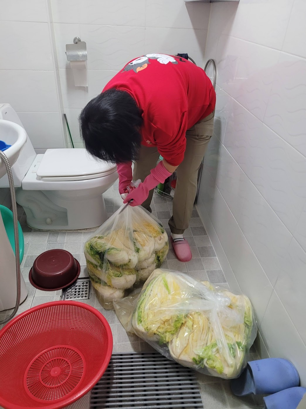 그리고 배추에서 물도 빼야 하니까 욕실은 깨끗하게 락스로 청소해 놓을게요~”