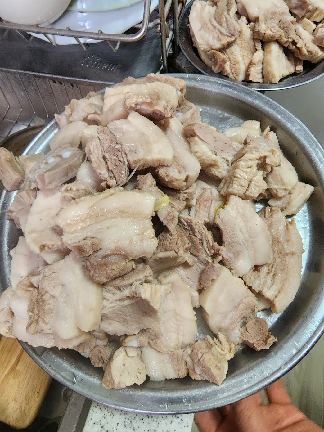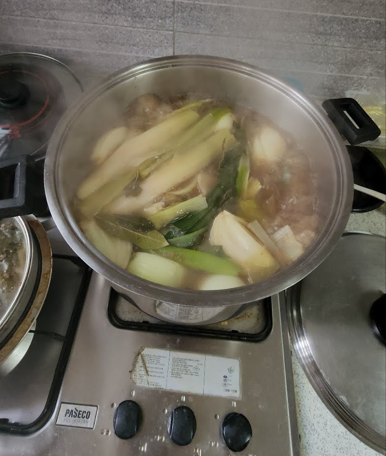 황희자 통장님께서 위아래 놓인 배추의 순서를 바꿔 뒤집을 때쯤 장 보러 간 팀이 돌아왔습니다. 몇 명은 쪽파와 갓을 다듬고, 요리에 자신 있는 김영희 봉사자님은 큰 냄비 가득 수육을 삶습니다. 누가 시키지 않았어도 각자 할 수 있을 일을 한 덕분에 금세 양념을 무칠 수 있게 됐습니다.