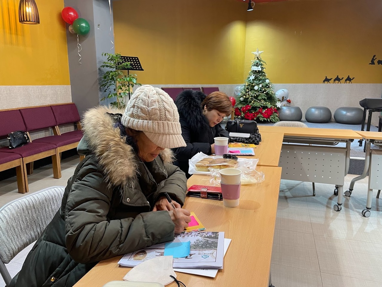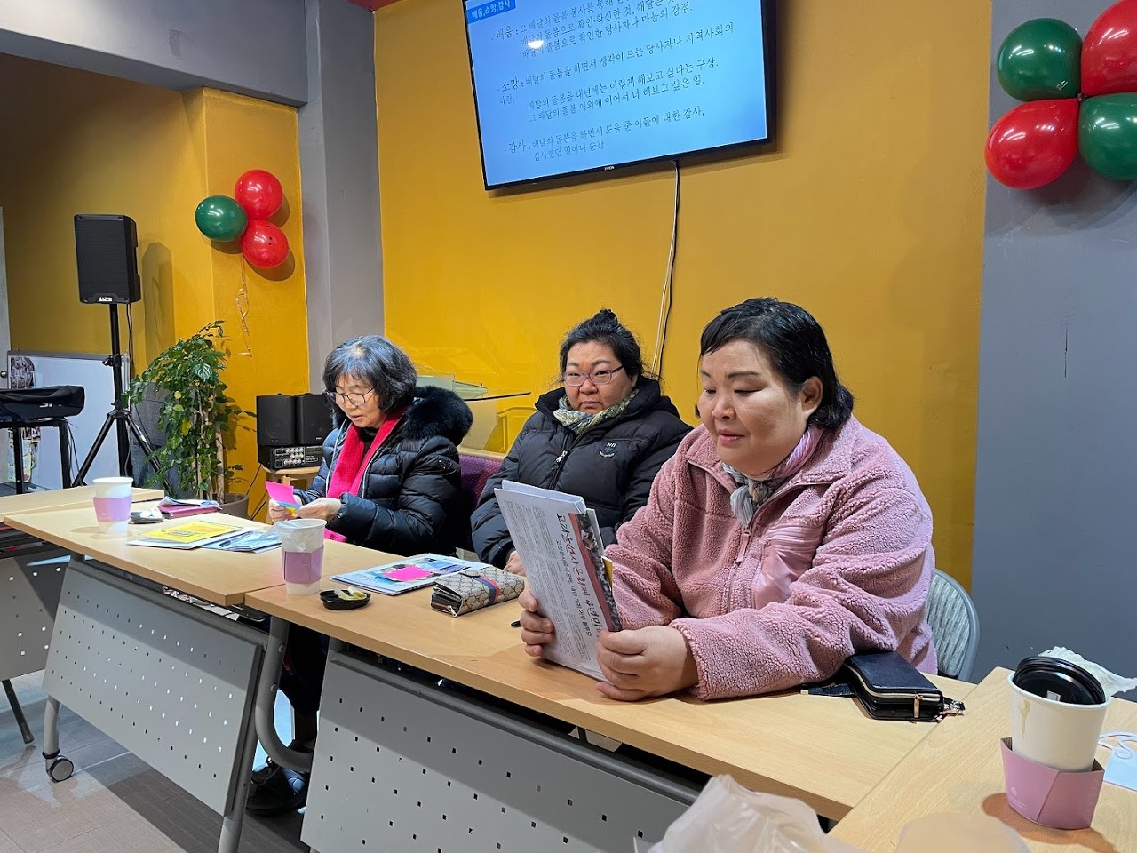 자연스럽게 인사 나누시는 사이에 다른 색의 종이를 세 장씩 나누어드리고, 올 한 해 동안 배달의 돌봄 활동을 통해 얻게 된 배움, 감사, 소망을 적어주시길 부탁드렸습니다.