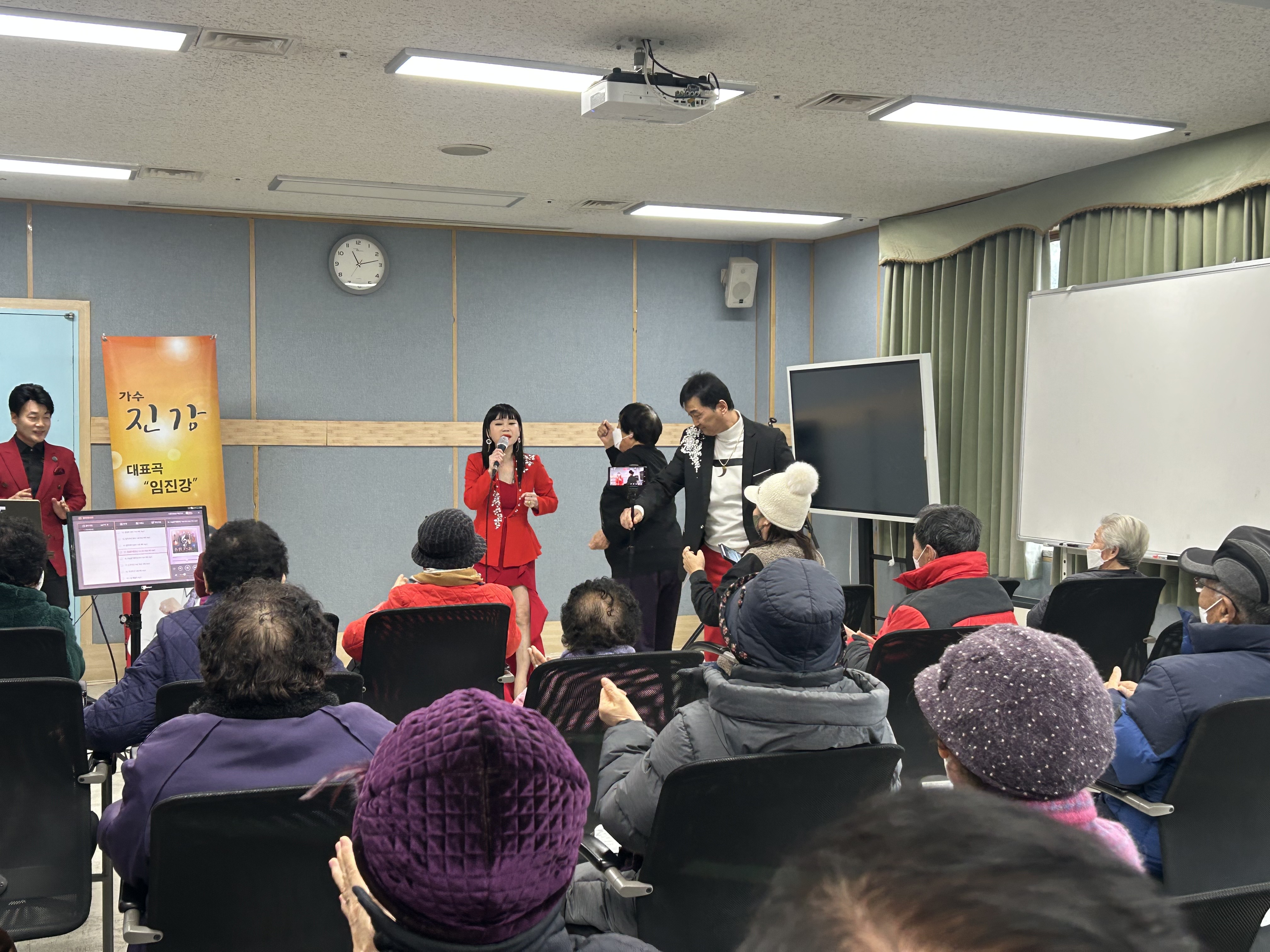 쿵짝 쿵짝 신나는 트로트 음악에 맞춰 어르신들이 박수치시며 공연을 즐겁게 즐기고 계십니다.