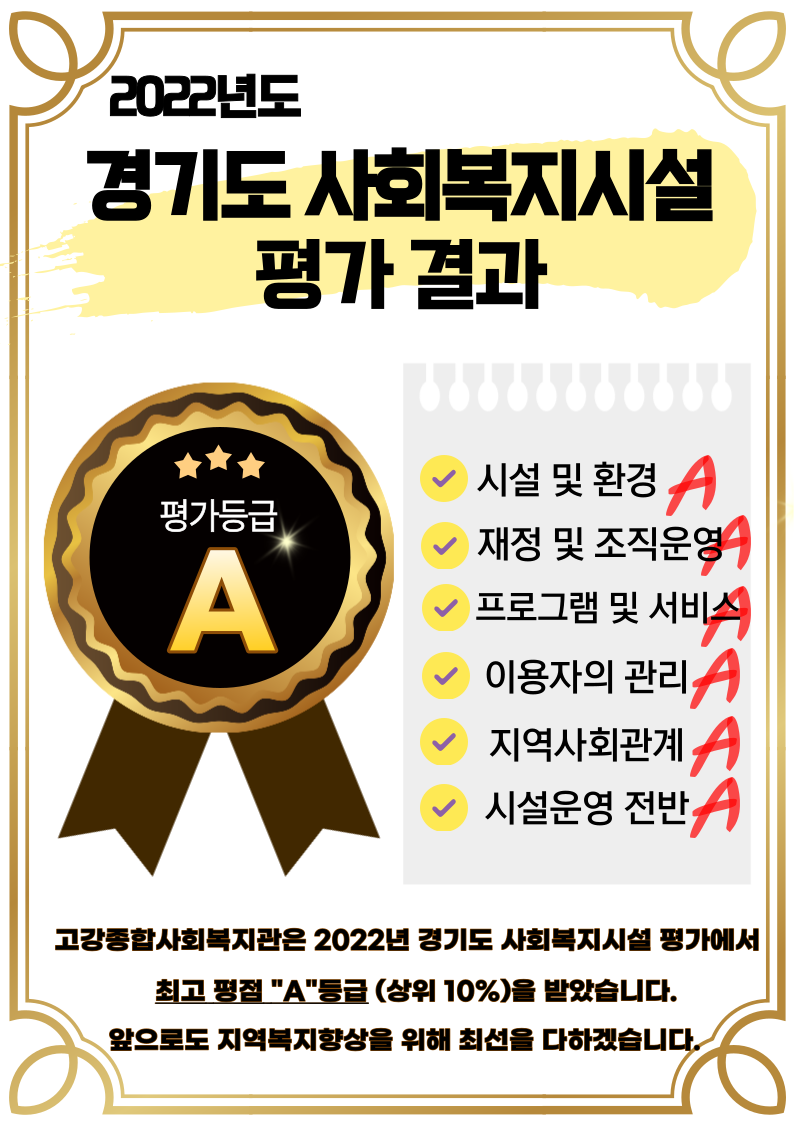 2022년도 경기도 사회복지시설 평가 결과 최고 평점 "A" , 우수시설로 선정되었습니다.
