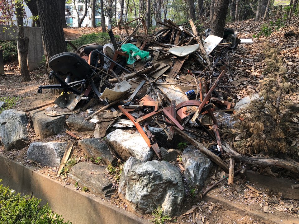 공원 탐방을 마치고 나오는 길목에 위험천만해보이는 나무쓰레기 더미들이 보입니다.