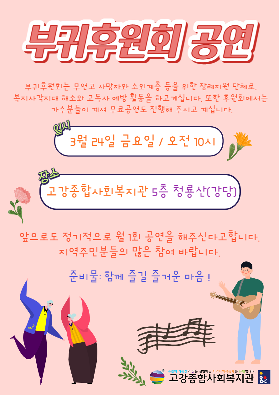 날이 많이 풀리고 따스해진 요즘, 앞으로 정기적으로 월1회 공연을 해주시겠다고한 부귀후원회에서 공연을 하러 복지관을 방문해주셨습니다.