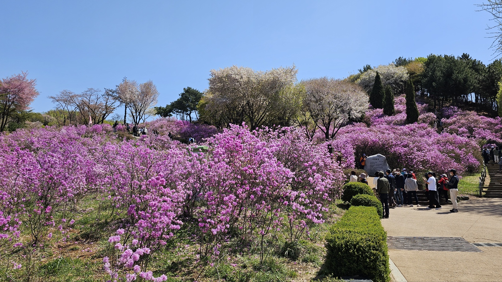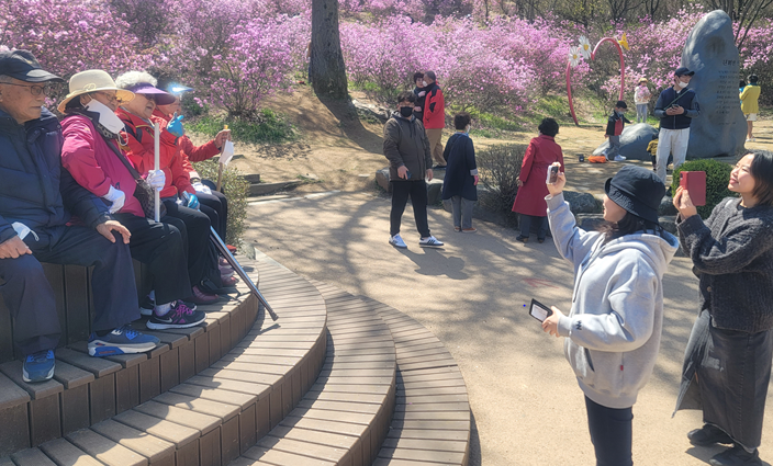 나들이를 가기 며칠 전, 비가 많이 와서 꽃이 많이 떨어졌을까 걱정이 되었는데, 걱정과는 달리 원미산의 진달래꽃은 활짝 이쁘게 잘 피어있었습니다.