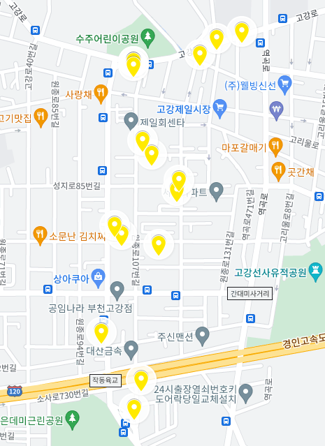 고강1동어린이집, 고강1주민지원센터, 고강동성당, 고리울꿈터작은도서관, 골목커피집, 꽃앤콩, 세븐일레븐 부천고강은데미점, 신선마트, 안시성, 엘리스클로젯, 우석셀프빨래방워시Q 고강점, 카페 기억, 커피마마퀸 부천고강점, 코리아 문구·완구, 행복한만찬, 헤어쁘띠, 호도스