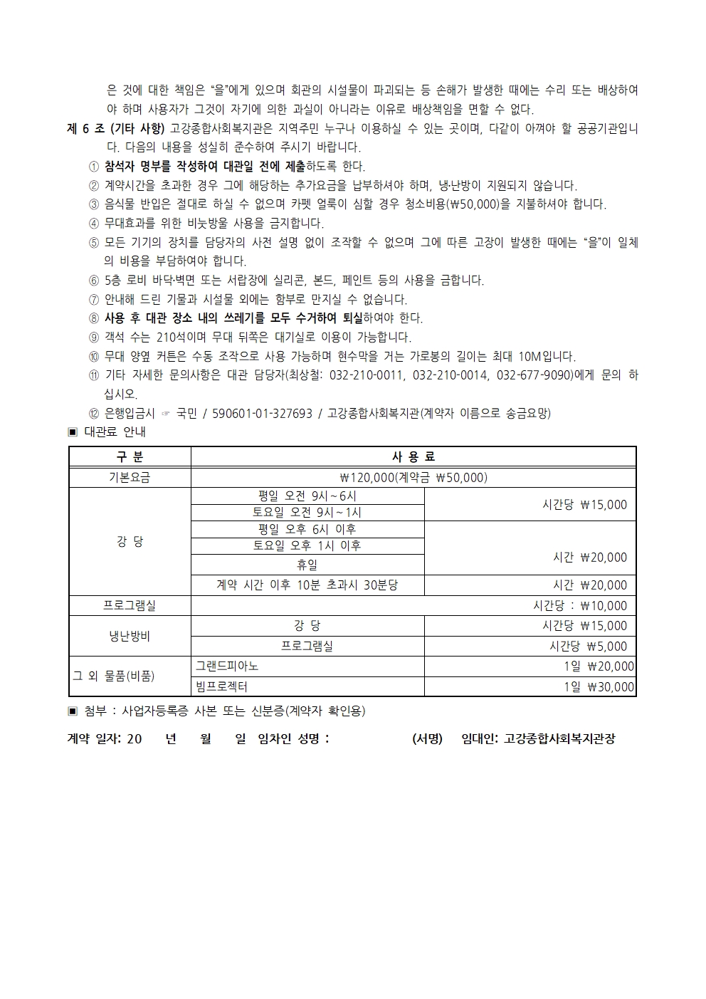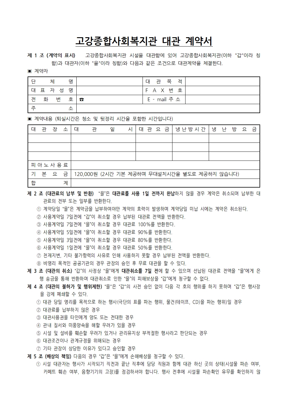 고강종합사회복지관 시설대관계약서입니다. 시설대관이 필요할 경우 첨부문서에 내용을 작성하여 담당자에게 문의바랍니다. * 주의: 담당자 연락 후 대관일정을 꼭! 확인하시기 바랍니다. 담당: 최상철실장(032-677-9090) 시설대관계약서.hwp 0.07MB 공유하기 게시글 관리 고강종합사회복지관 저작자표시 비영리 (새창열림)