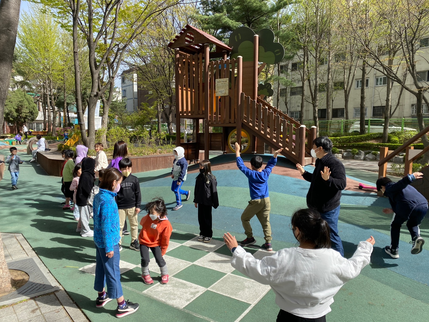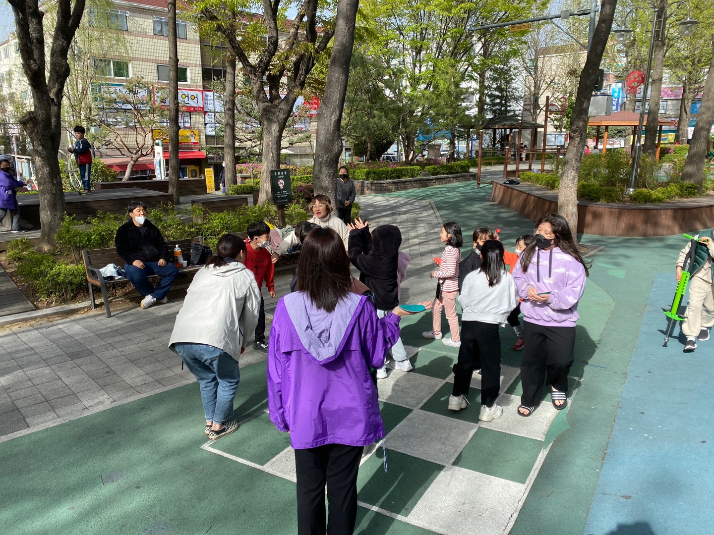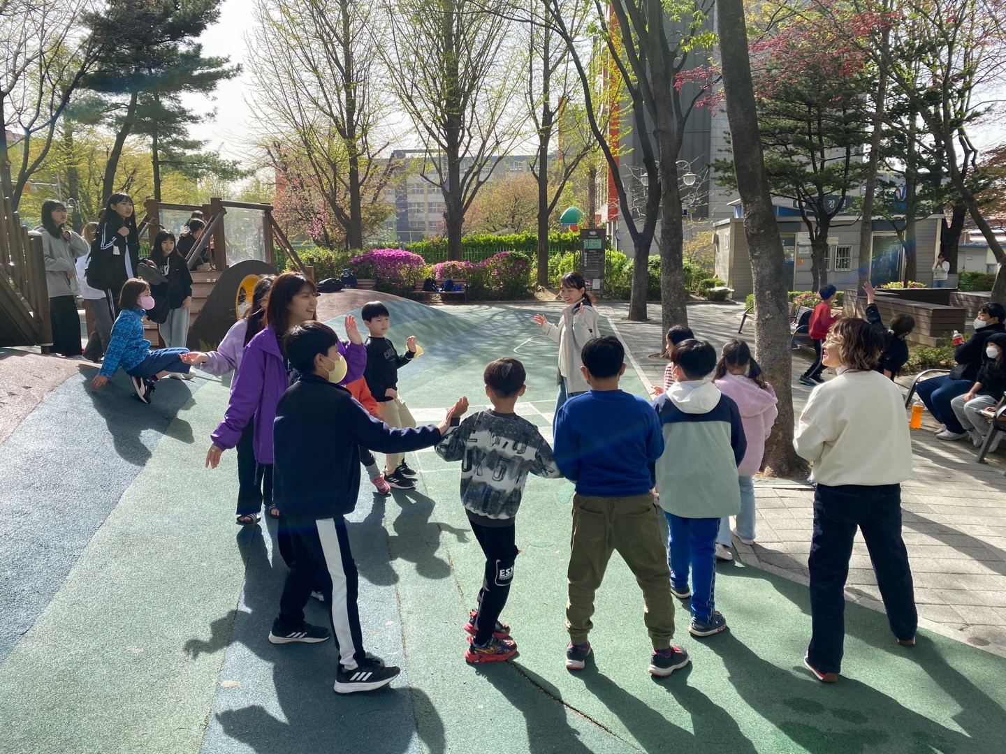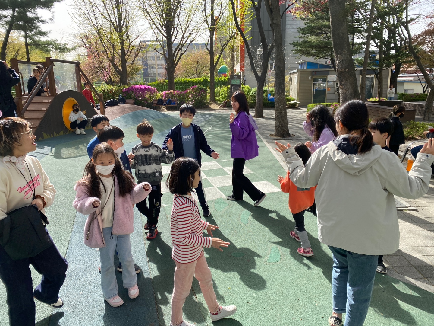 공원에서 이미 시간을 보내던 다른 아이들도 함께 어울리며 시작했습니다.