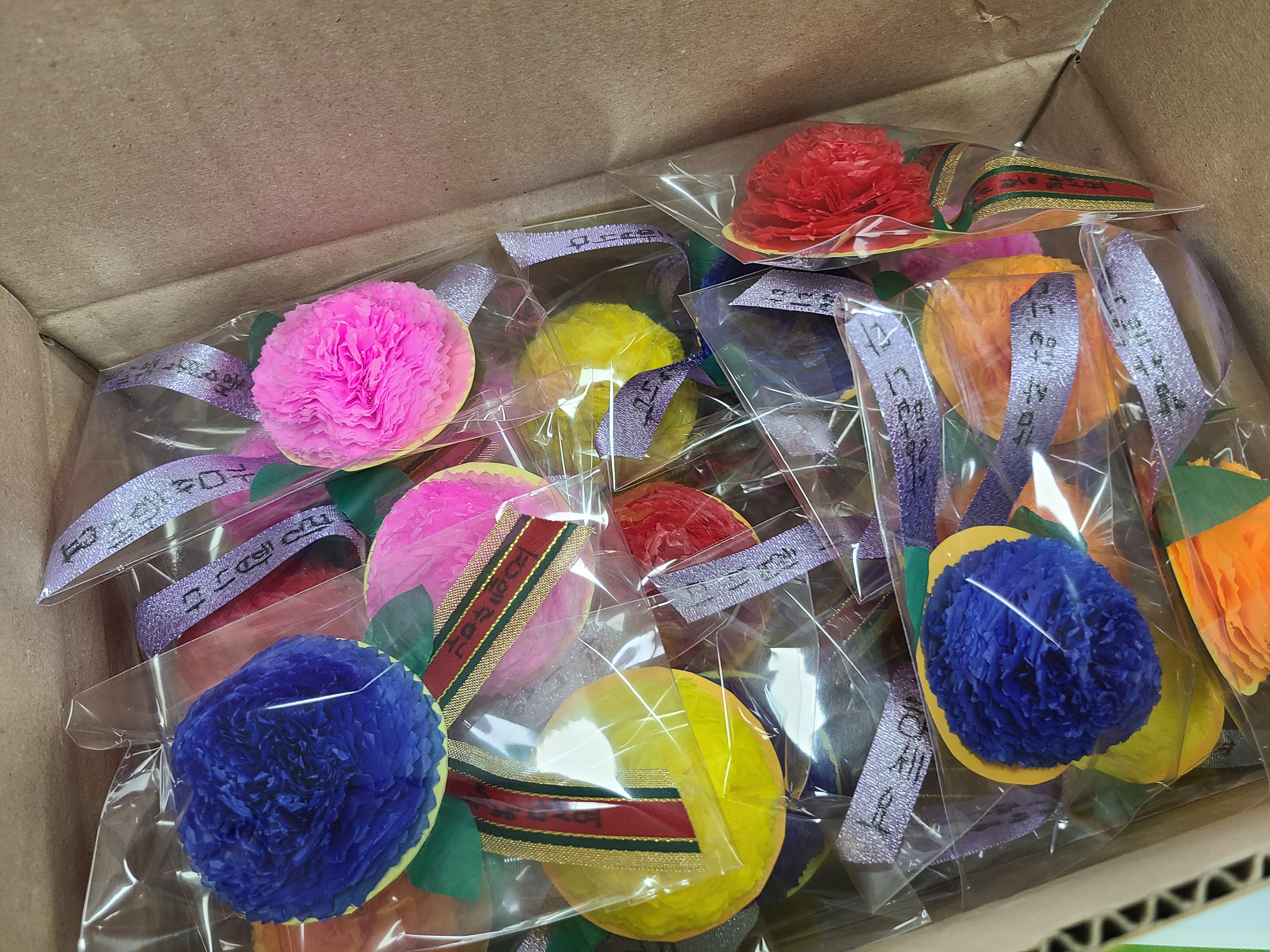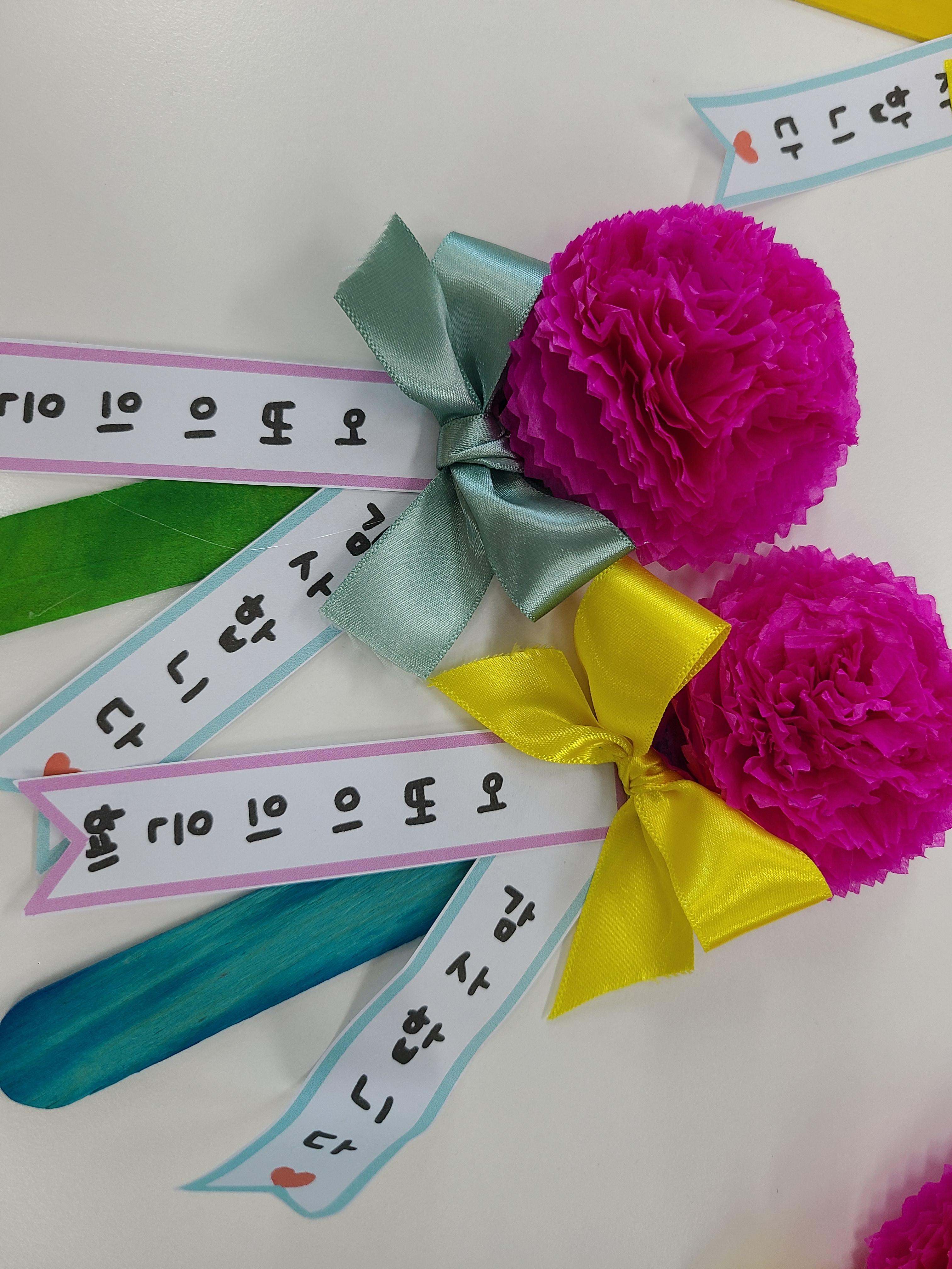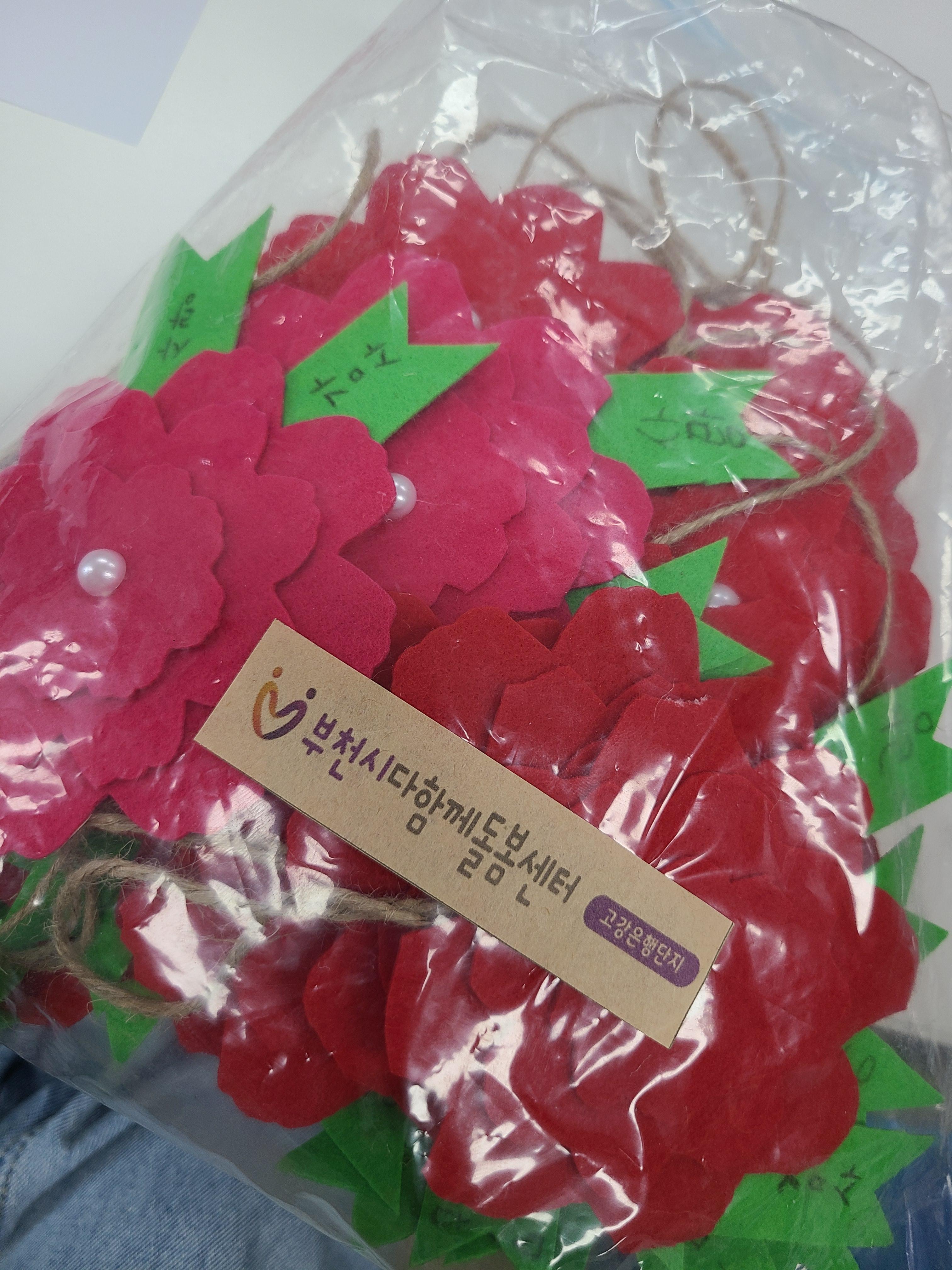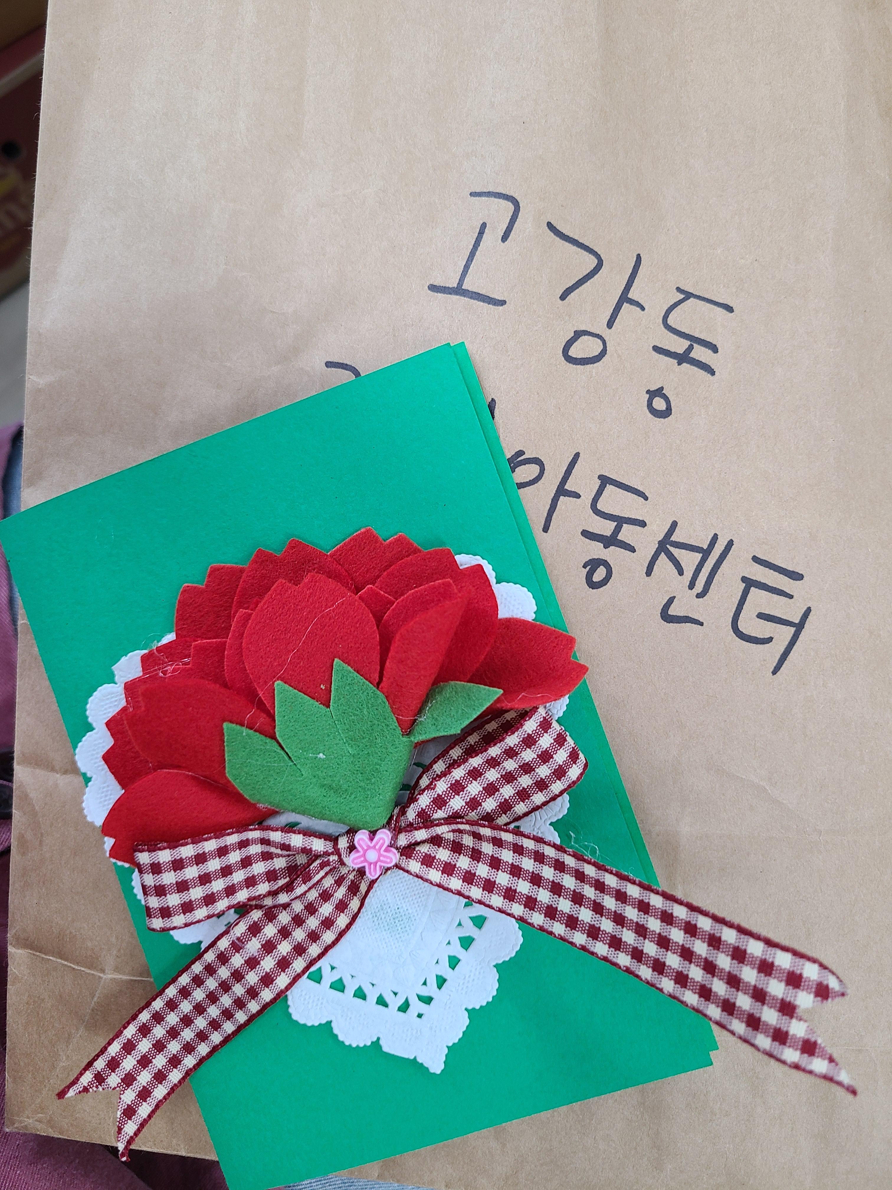 고강어린이집, 늘사랑어린이집, 금빛어린이집, 비전지역아동센터, 경서지역아동센터, 고강동지역아동센터, 영광지역아동센터, 모나쉬지역아동센터, 다함께돌봄센터에서 만든 카네이션을 보내주셨습니다.