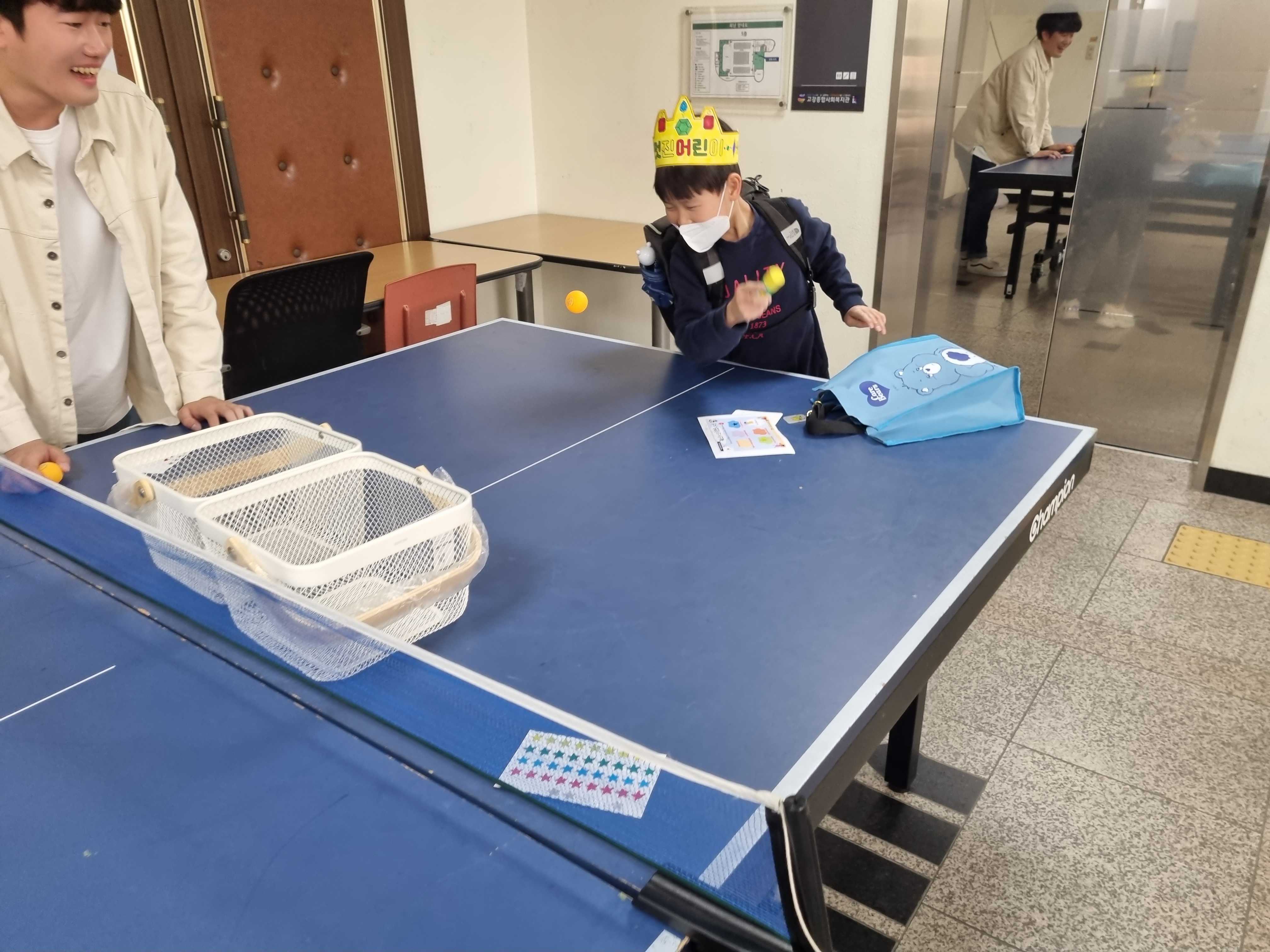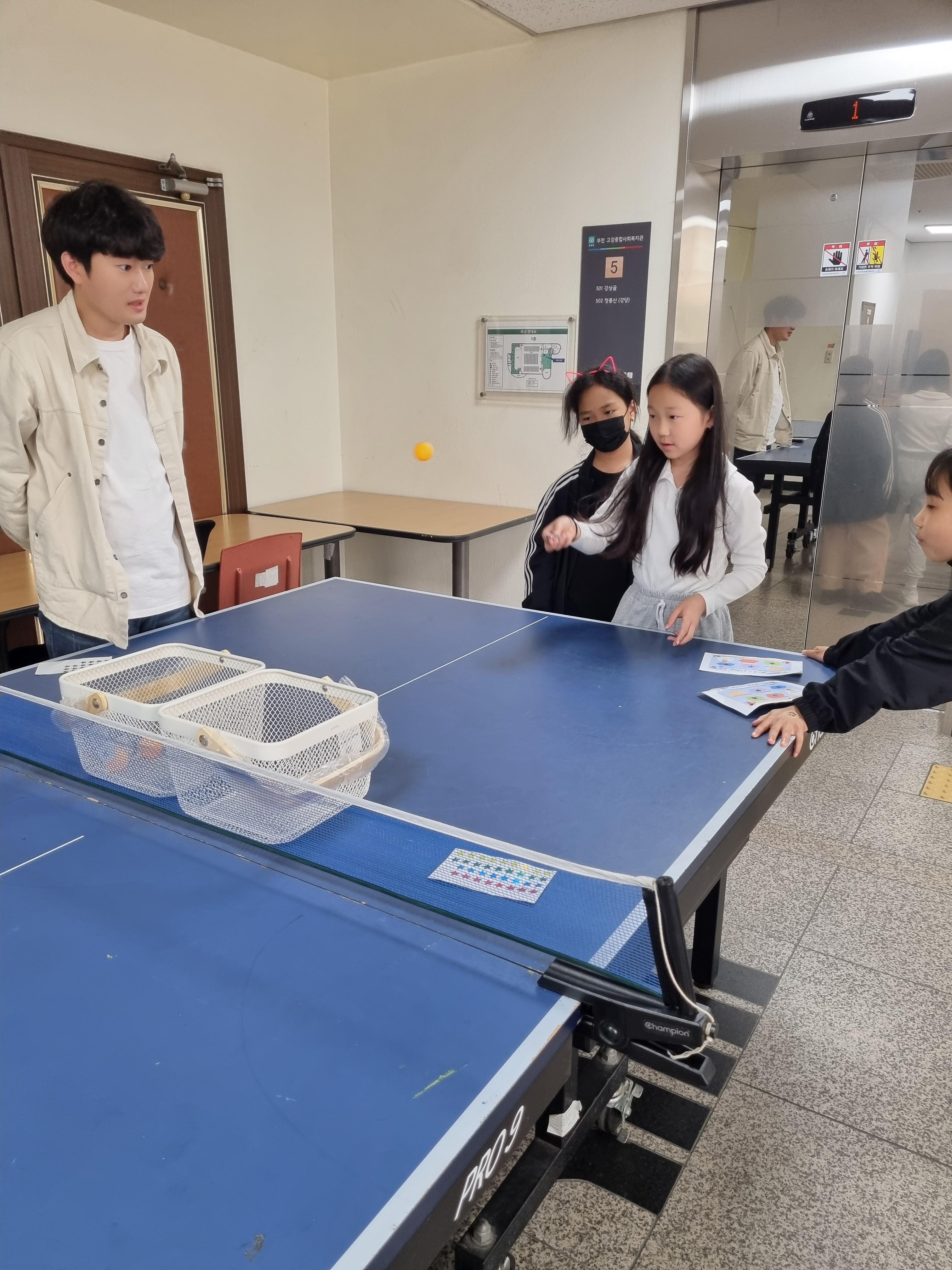 힘들게 올라간 5층에서는 탁구대가 친구들을 기다리고 있습니다.