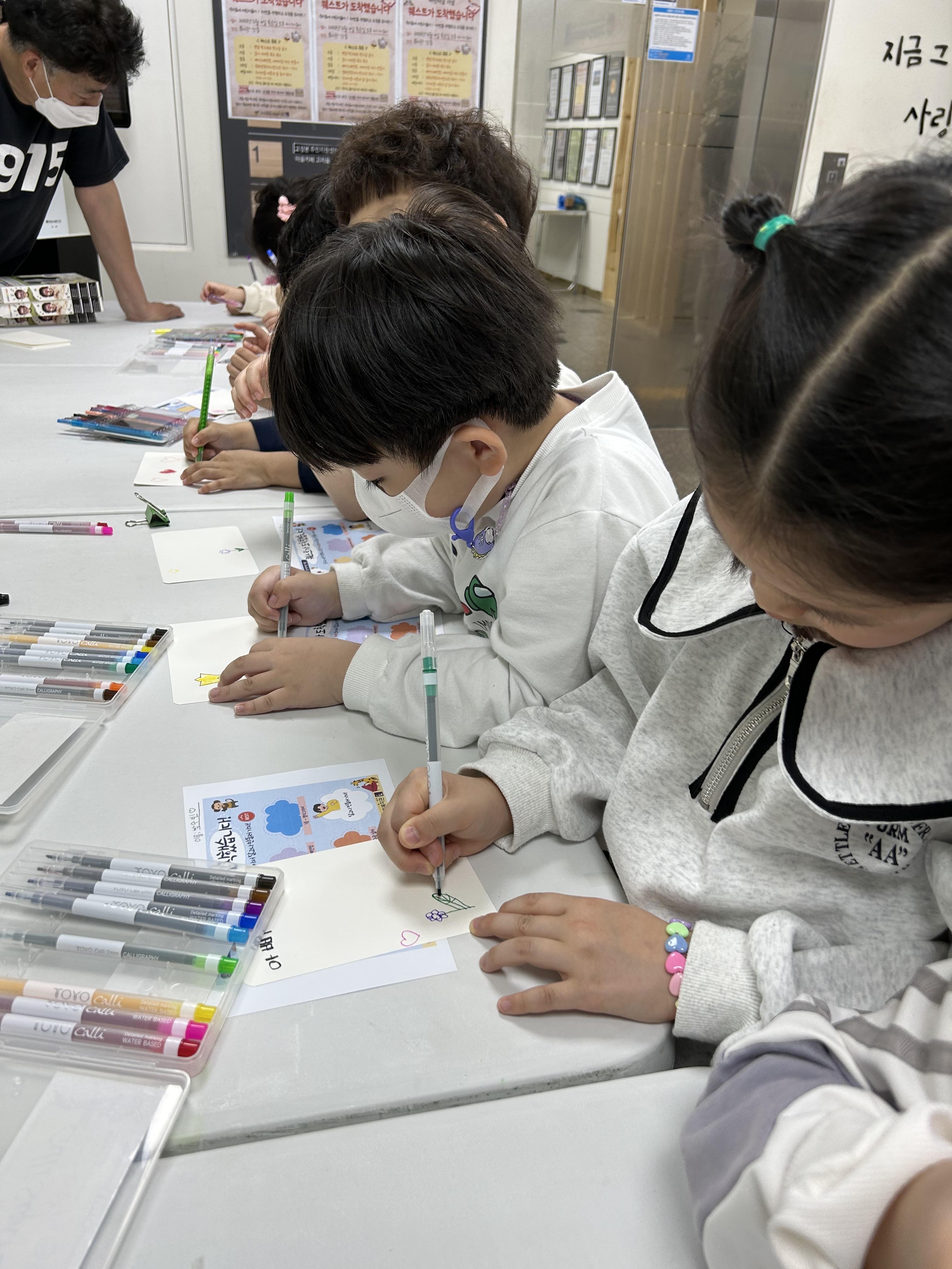 어버이 날을 맞이하여 어버이날 카드를 만들고, 나보다 어린 동생의 손에 그림을 그려주기도 합니다.