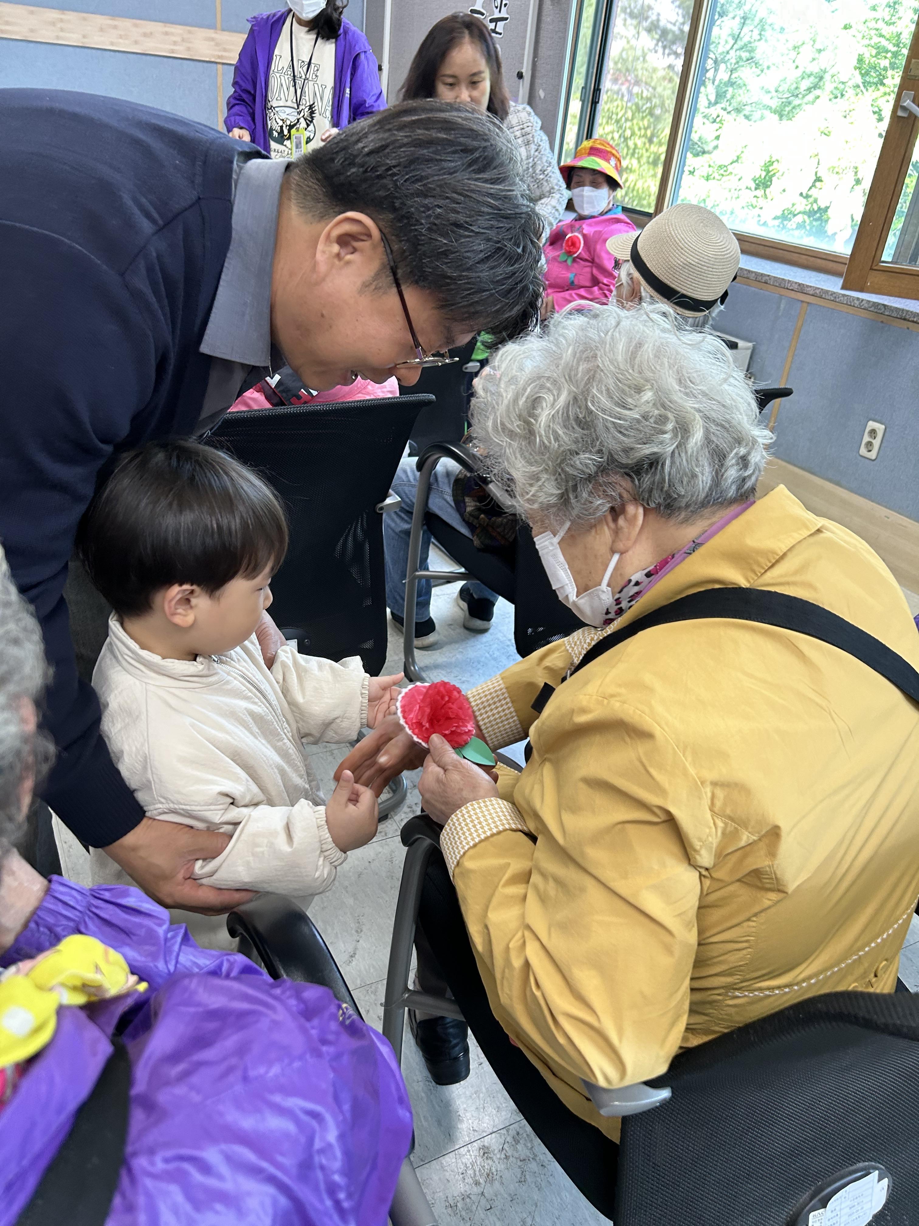 아이들이 손수 만든 카네이션을 저희에게 주시면 복지관, 지역 어르신들께 달아드립니다.