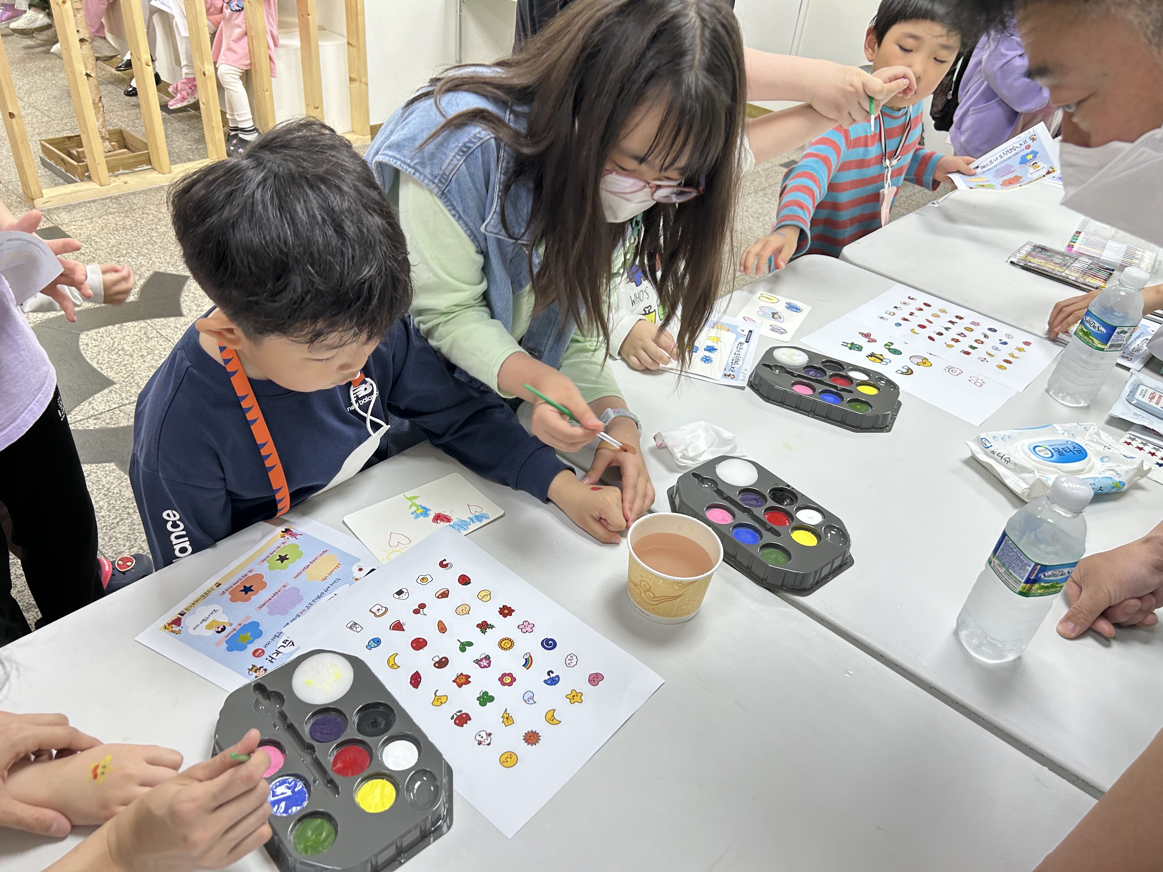 페이스페인팅은 초등학교 중학년부터는 충분히 할 수 있다는 생각에 1시~3시까지는 물감과 도안만 준비해 뒀는데 생각보다 어린아이들이 많이 왔고, 참여를 어려워해서 어른들의 도움이 필요했습니다.