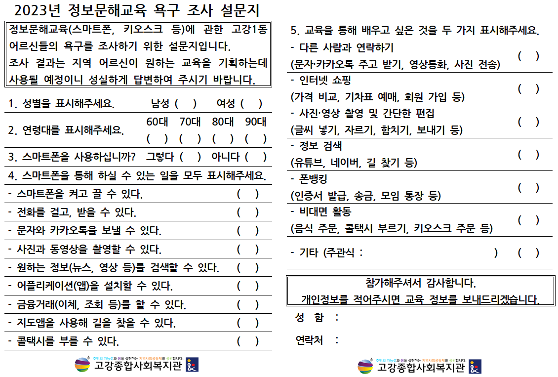 100명 이상의 어르신을 대상으로 조사를 하여 마을 어르신들이 스마트폰을 어느 정도로 다룰 수 있는지 확인하고, 가장 배우고 싶은 것이 무엇인지 확인할 예정입니다.