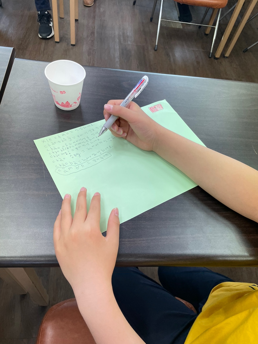 간단한 인삿말을 배워 본 아이들은 종이에 오늘 배운 내용들을 열심히 적습니다.
