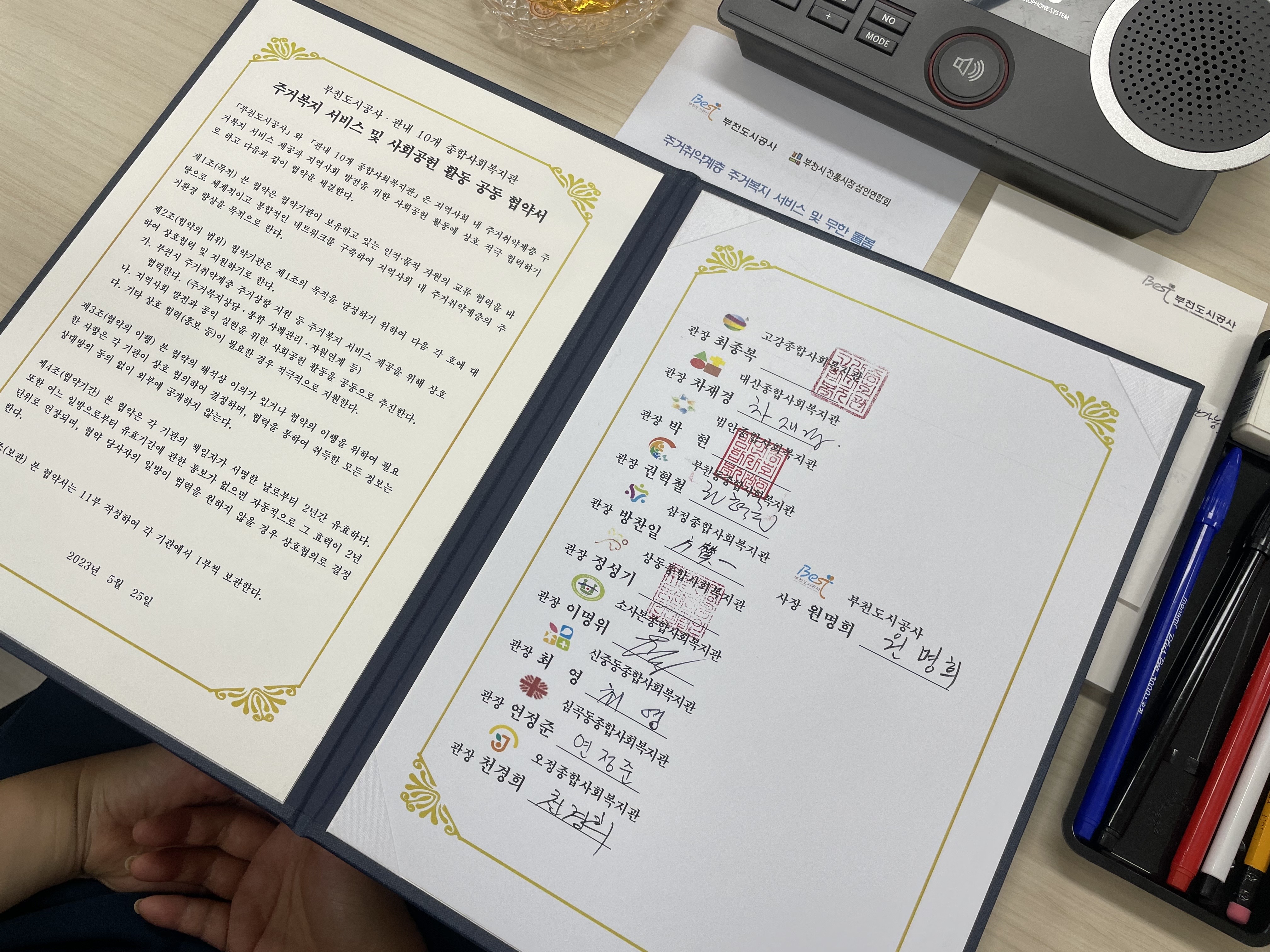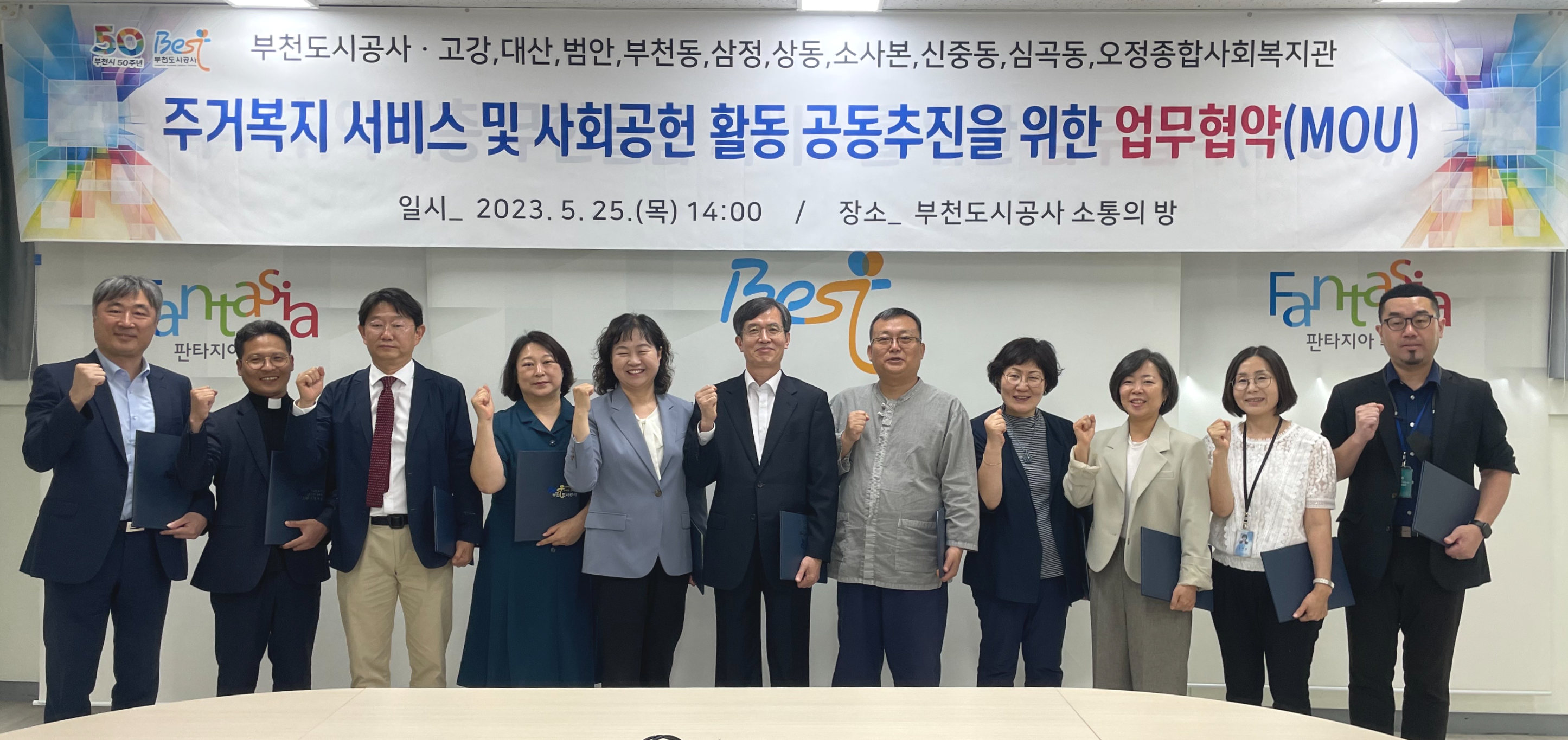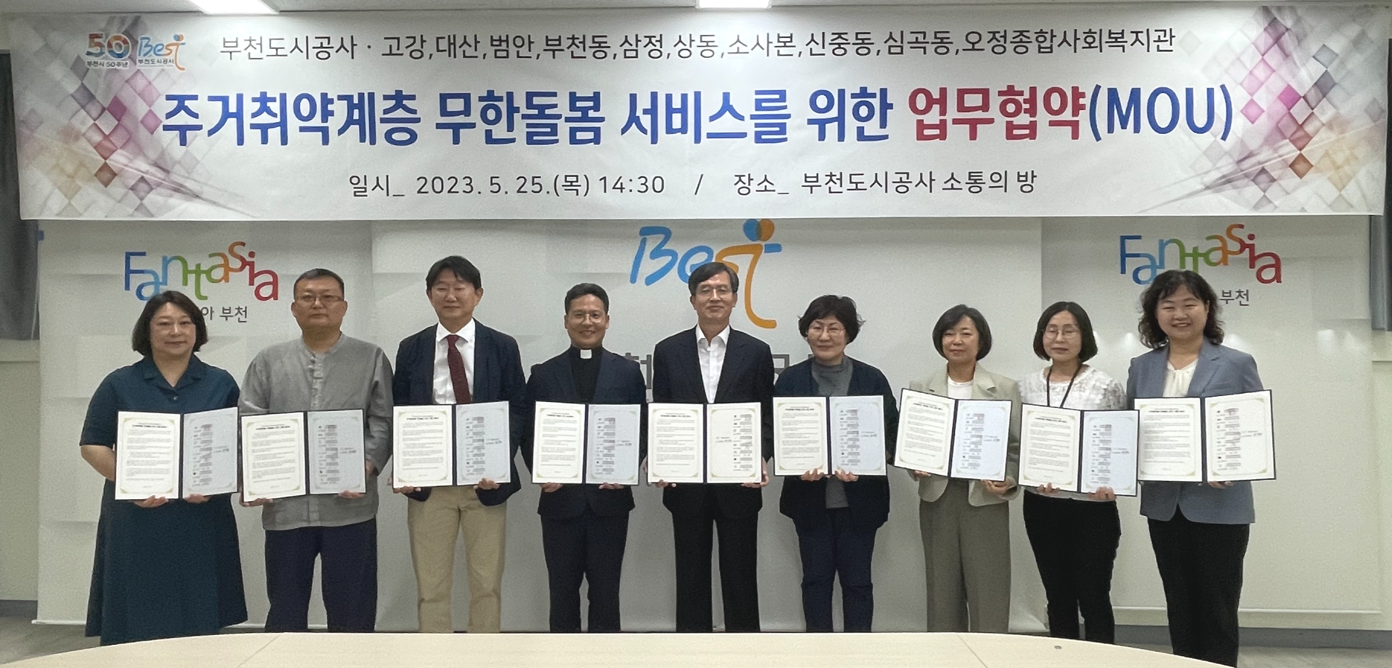 부천도시공사와 부천 관내 10개 종합사회복지관(고강,대산, 범안, 부천동, 삼정, 상동, 소사본, 신중동, 심곡동, 오정), 그리고 8개 무한돌봄네트워크팀(고강,대산, 부천동, 상동, 소사본, 신중동, 심곡동, 오정)이 2023년 5월 25일 지역사회내 주거취약계층 주거복지 서비스 제공과 지역사회 발전을 위한 사회공헌 활동에 상호 적극 협력하기 위한 업무협약을 체결했습니다.