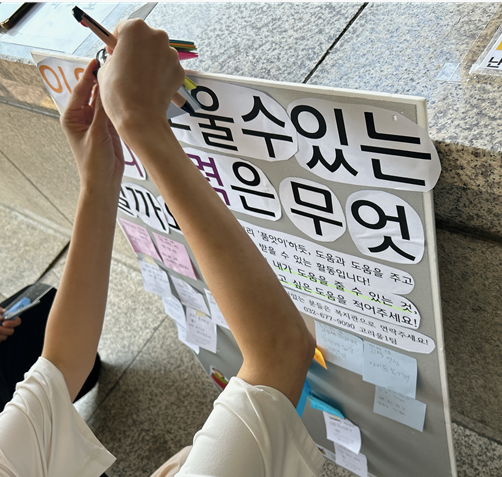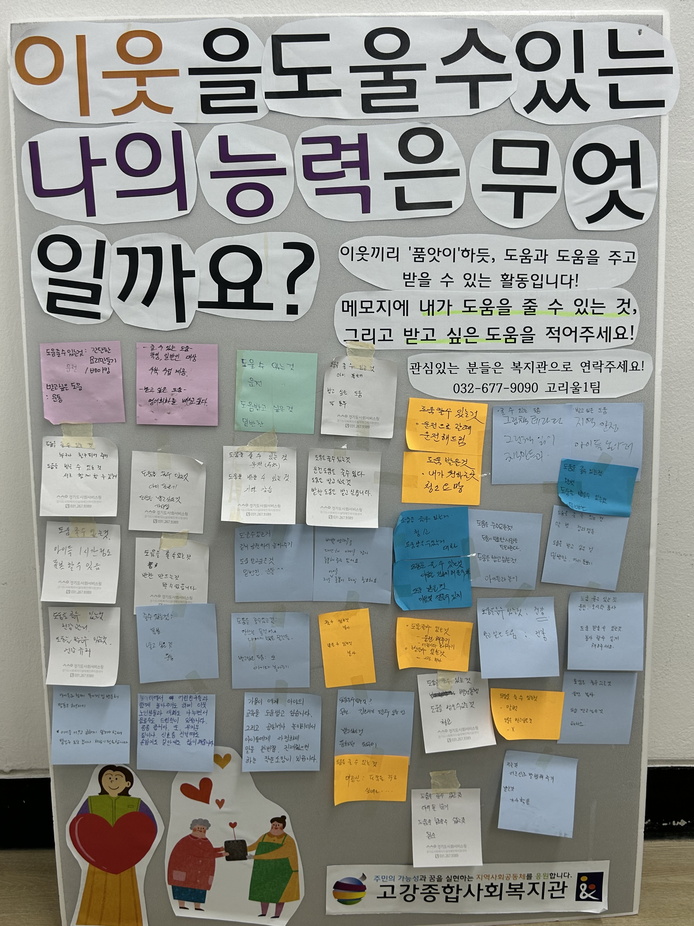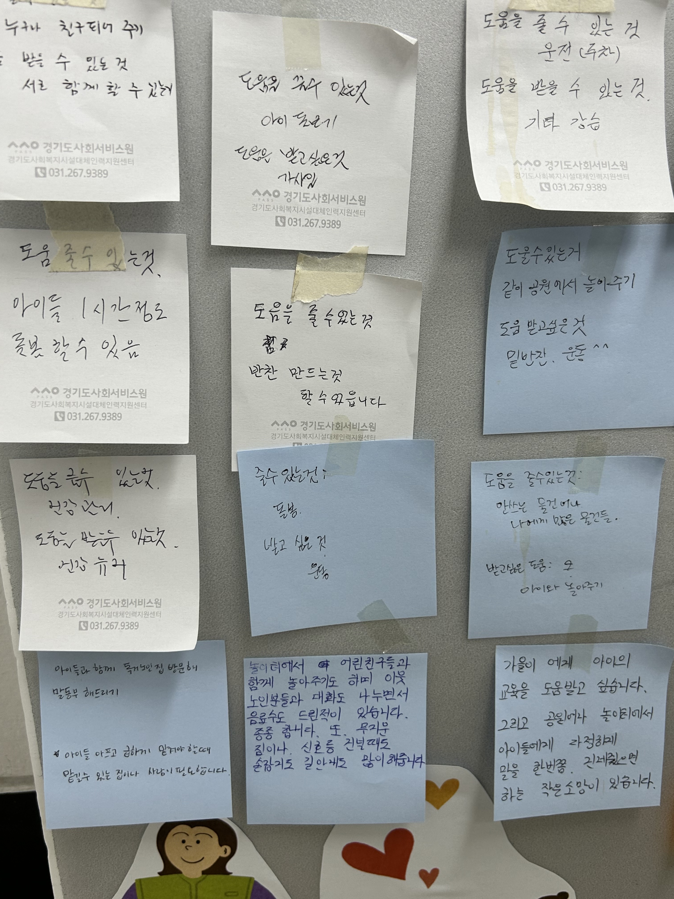 타임뱅크 활동가이신 박00님과 함께 복지관을 왔다갔다 하시는 지역주민분들에게 타임크란 '이웃품앗이'같은 활동이라고 쉽게 소개해드리며 받고싶은 도움과 내가 줄 수 있는 도움이 무엇이 있는지 포스트잇에 적고 이야기 나눴습니다 :)