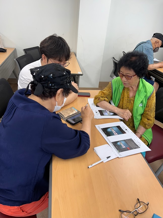 각자의 사정으로 함께하지 못해 아쉽지만 더위 속에서도 교육에 참여한 어르신들과 최선을 다해 함께 하기로 합니다. 지난번과 달리 처음부터 1:1로 진행할 수 있는 상황이라 파트너 활동가들과 어르신이 짝을 지어 나란히 않아 교육을 진행합니다.