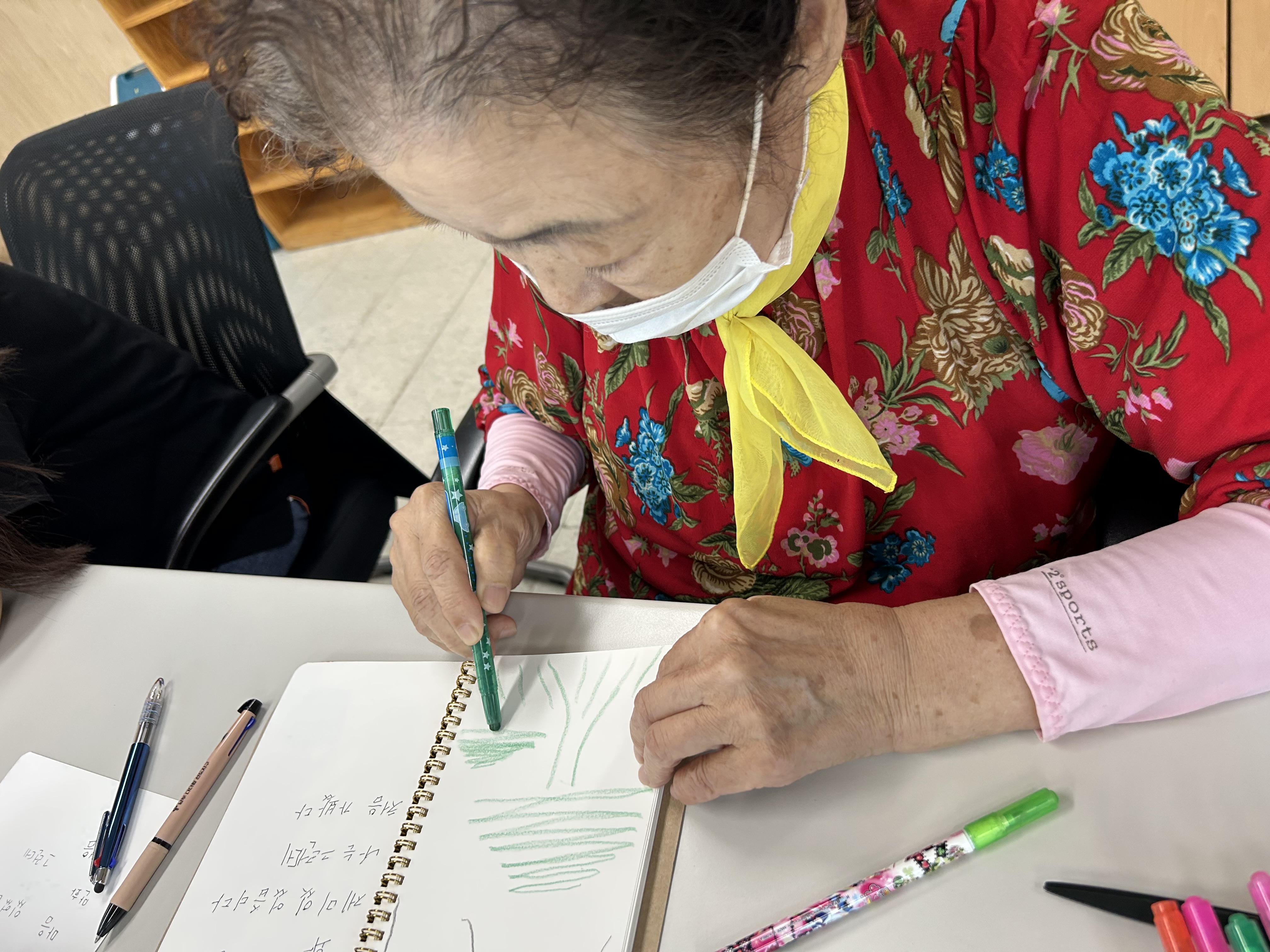 어르신들께서는 "그때 무엇을 봤었었지~? 기억이 가물가물해~" 라고 하시며 색연필을 들고 그림을 그리셨습니다.