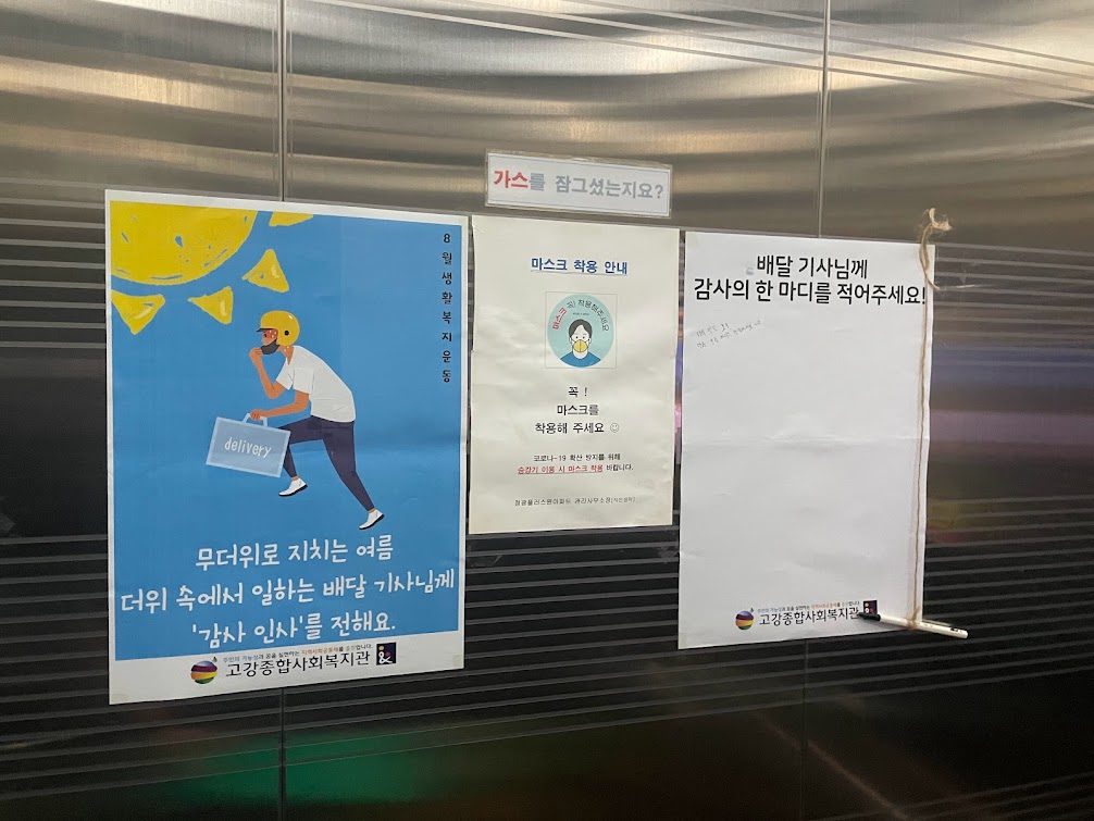 승강기 내에 포스터를 부착하고 있을 때 주민 몇 분과 인사 나누었습니다.
