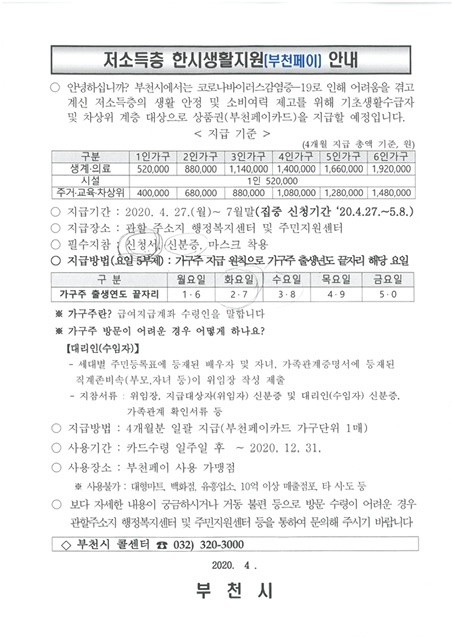 부천시에서는 코로나바이러스감염증-19로 인해 어려움을 겪고 계신 저소득층의 생활안정 및 소비여력 제고를 위해 기초생활수급자 및 차상위 계층 대상으로 부천페이를 오늘부터 지급하고 있습니다.