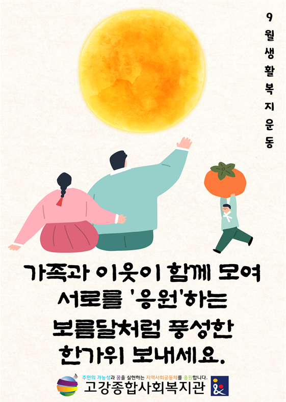 이에 수주팀은 모든 주민이 가족, 이웃과 함께 모여 서로를 ‘응원’하며 보름달처럼 풍성한 한가위를 보내길 바라는 마음으로 9월 생활복지운동을 준비해 마을로 나섰습니다.
