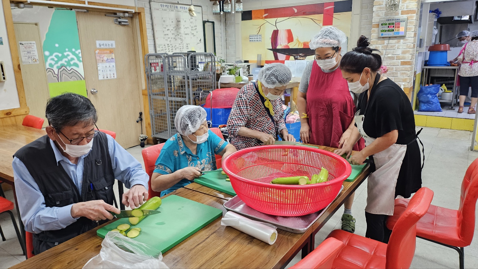 복지관의 식당을 이용하시는 어르신들께서는 종종 식재료 전처리 작업을 도와주십니다. 나물이 들어오면 손질해주시고, 삼삼오오 모여 재료를 다듬어 주십니다.