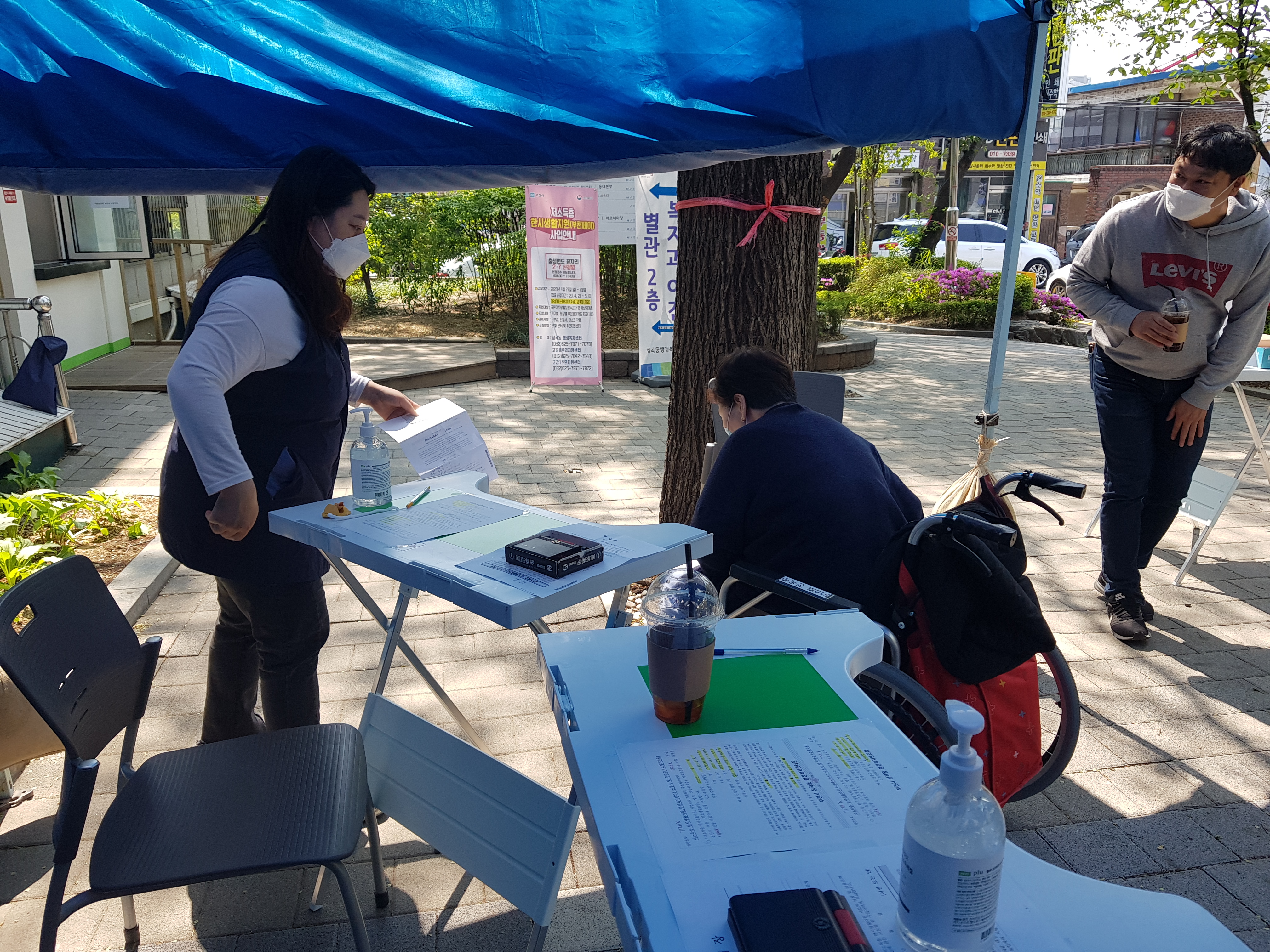 성곡동행정복지센터에서는 접수를 안내하는 복지관 직원 및