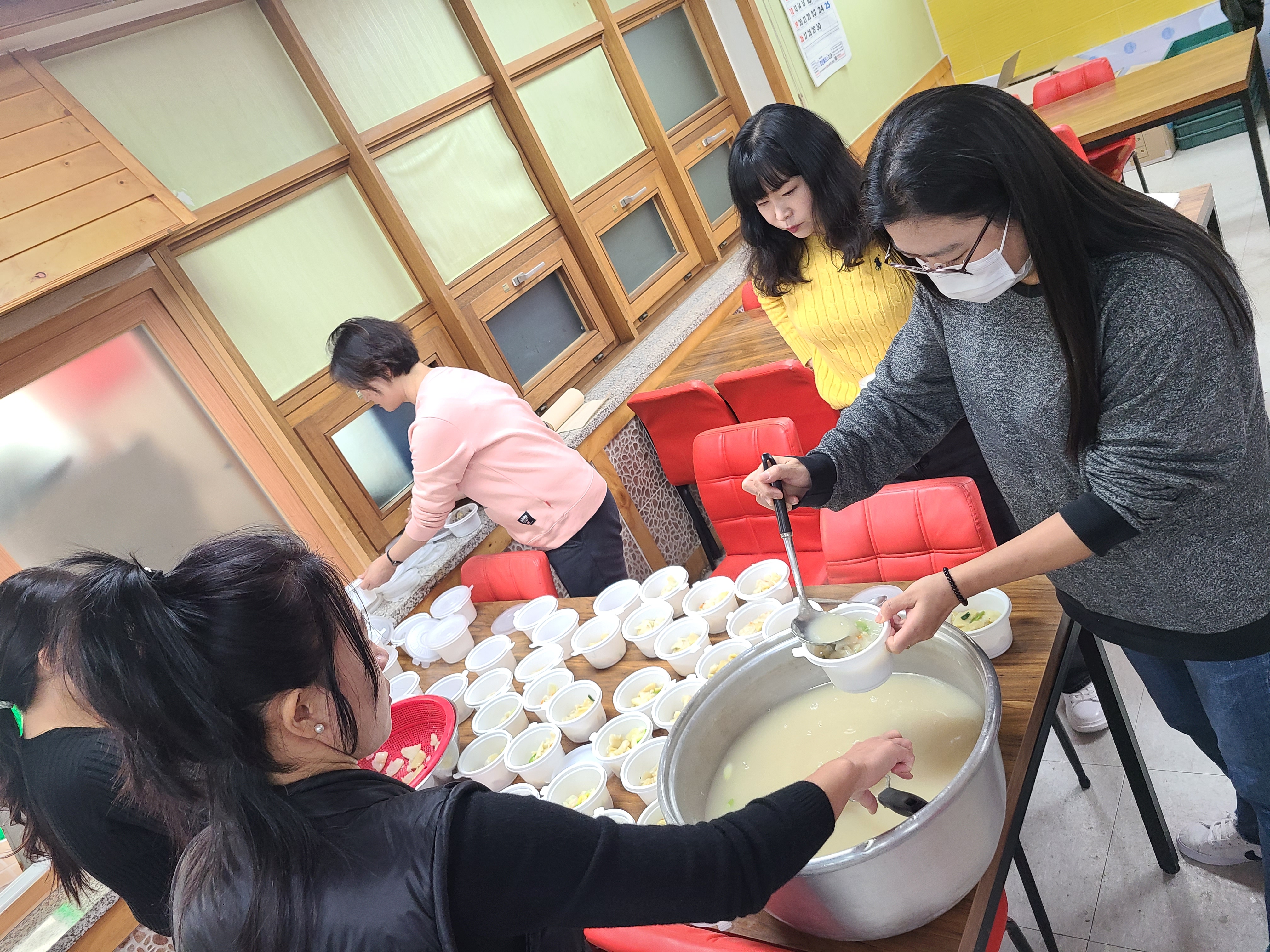 공연을 마치고 내려오니 뜨끈한 수제비가 기다리고 있습니다. 배달할 도시락도 싸고, 어르신들이 드실 음식도 준비되었습니다.