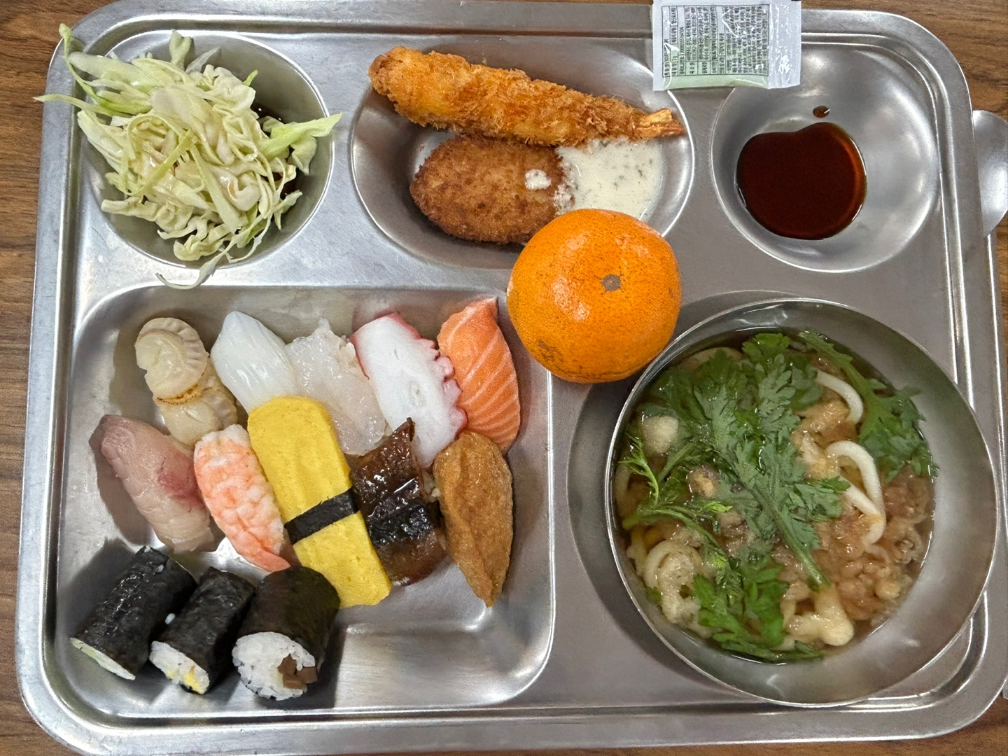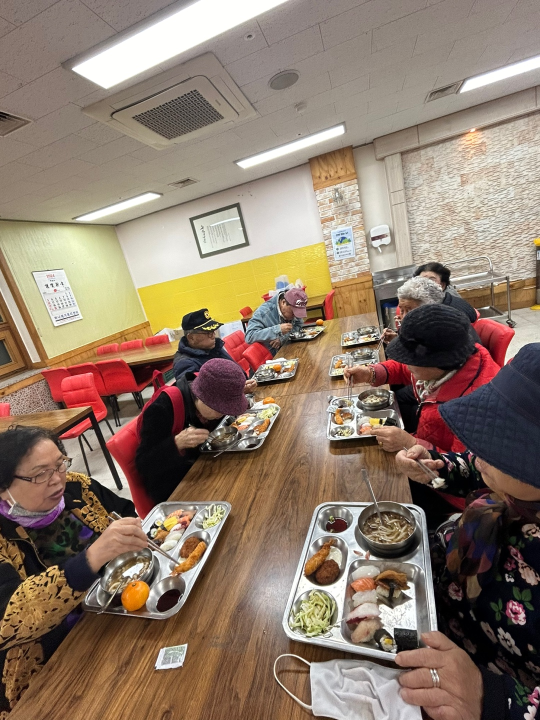 연말을 맞이하여 행복더하기 봉사단에서는 초밥과 뜨끈한 우동, 샐러드와 상큼한 귤까지! 일식정식처럼 준비를 해주셨습니다~
