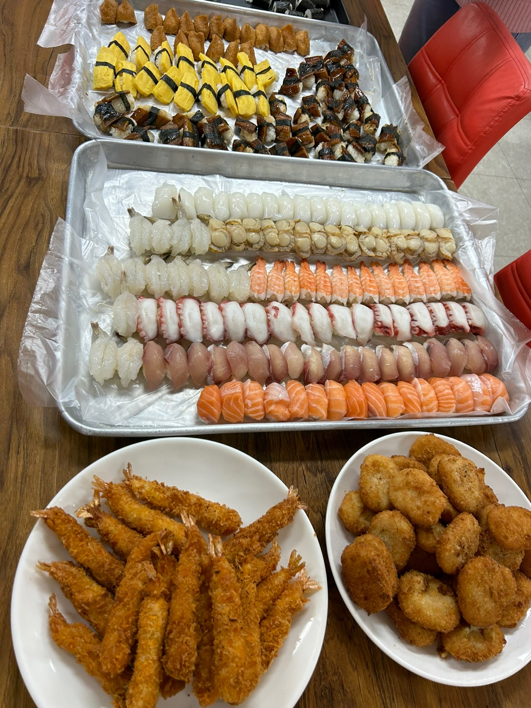 다양한 종류의 초밥이 준비되어 어르신들께 드릴 준비를 합니다.