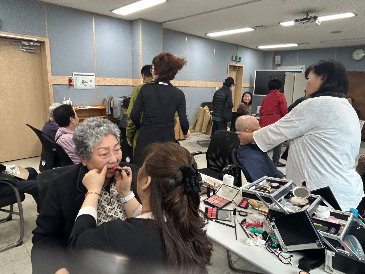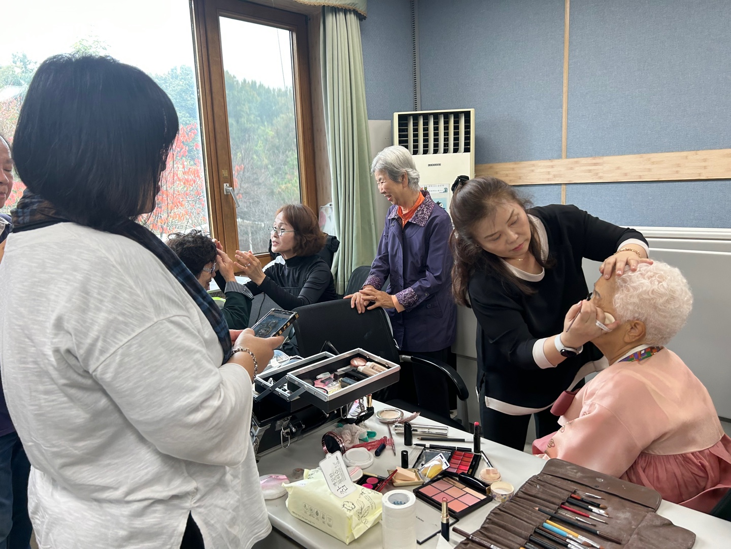 한쪽에선 어르신의 옷매무새를 다듬어 주시고, 또 다른 분은 어르신의 얼굴이 더 환해지도록 화장을 도와주셨습니다.