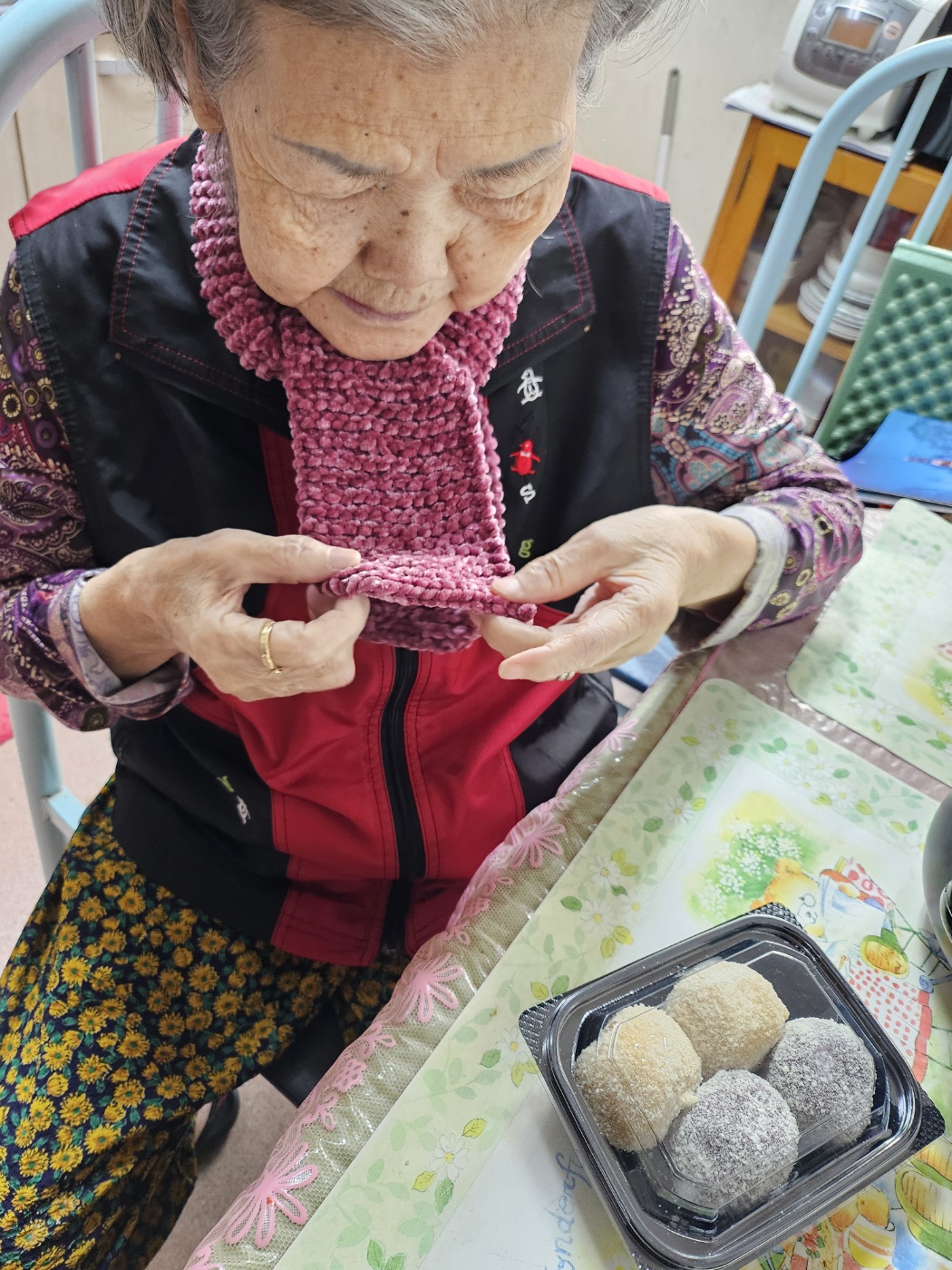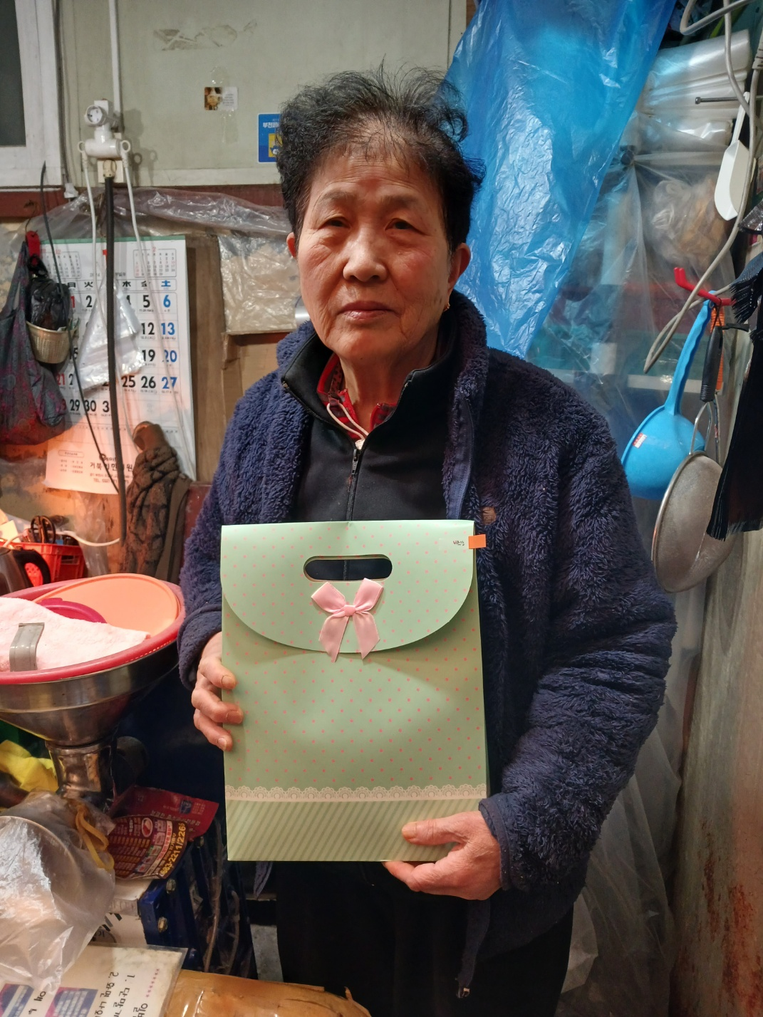 어르신들께 떡과 함께 잘 전달드렸습니다! 시장에서 일하시는 어르신, 추운 겨울 잘 보낼 수 있겠다며 감사인사와 새해 인사까지 전해주셨습니다. 어르신들께도 예쁜 목도리가 어떻게 완성되었는지도 설명드리며 타임뱅크도 소개했습니다!