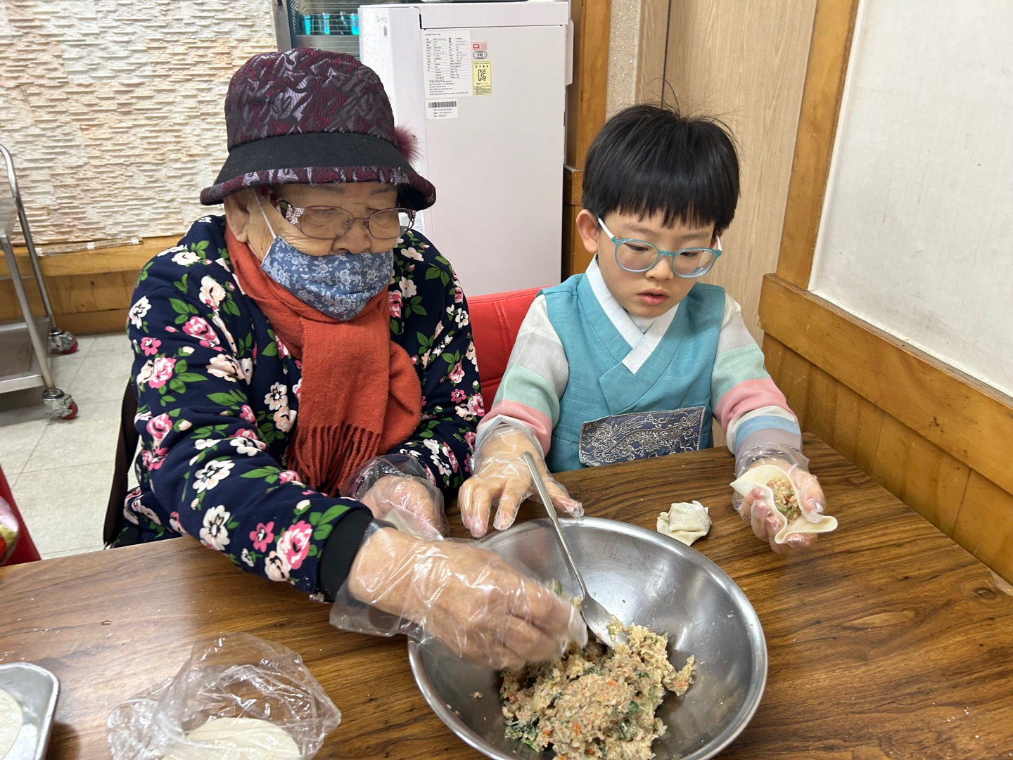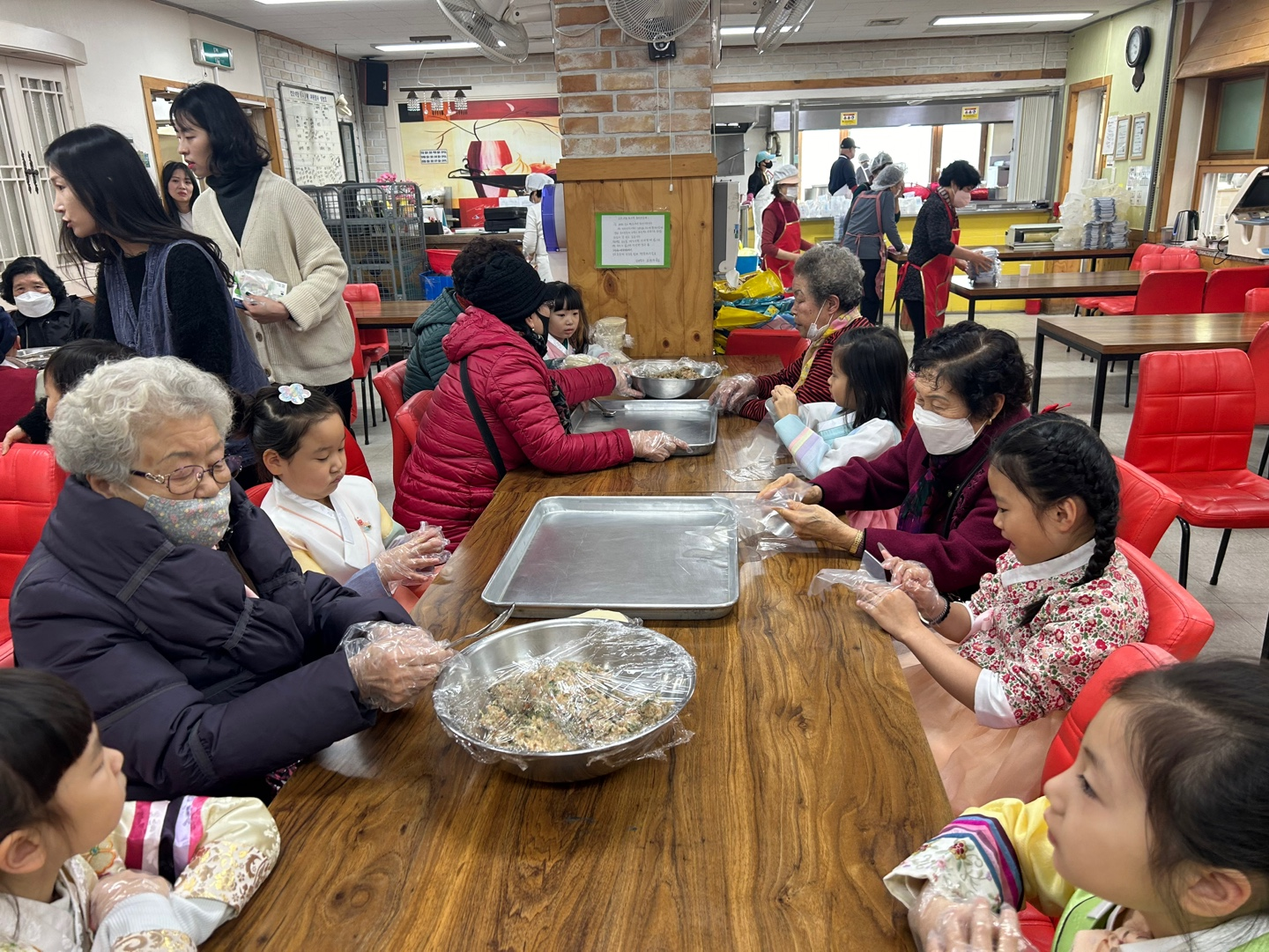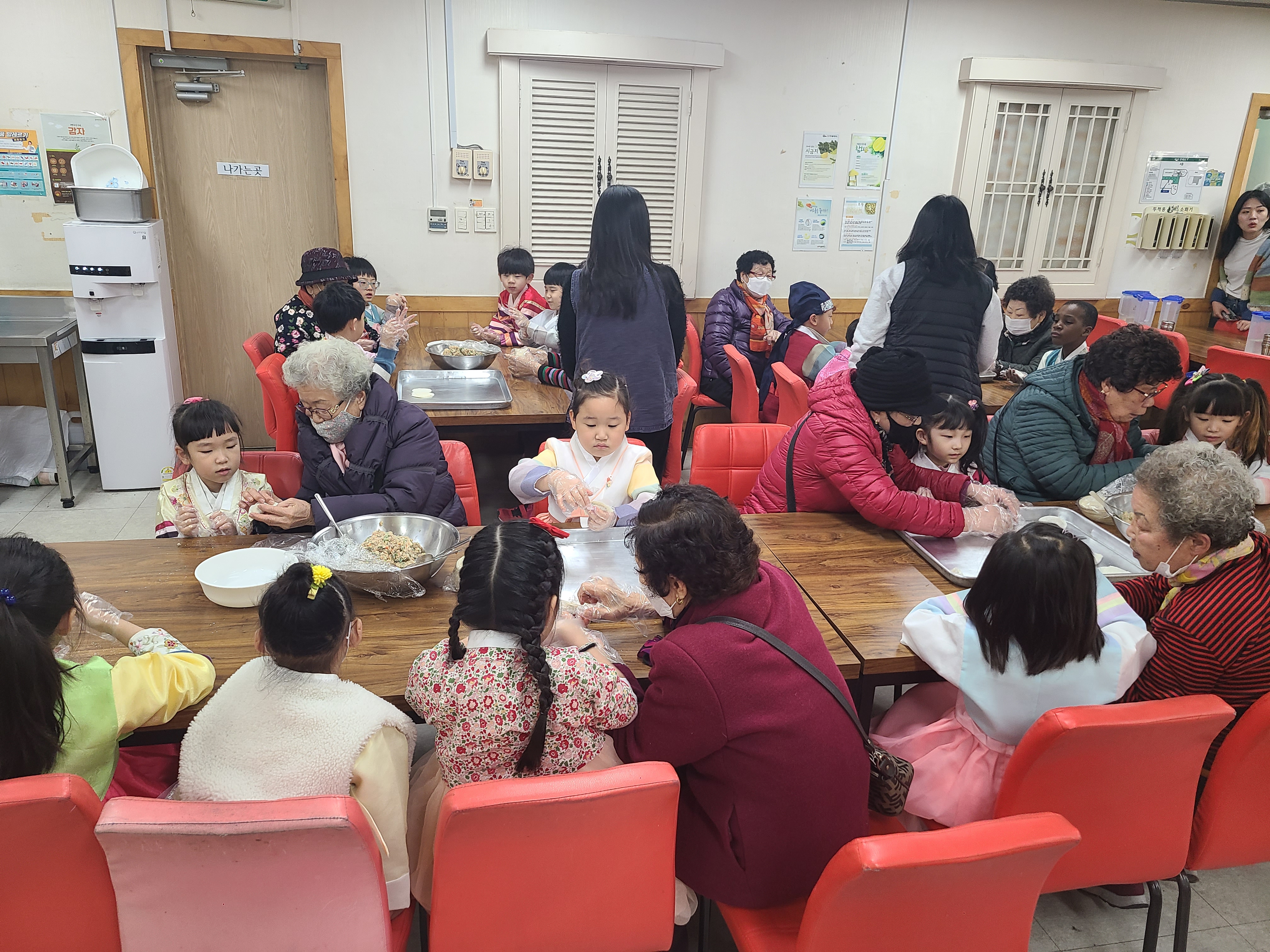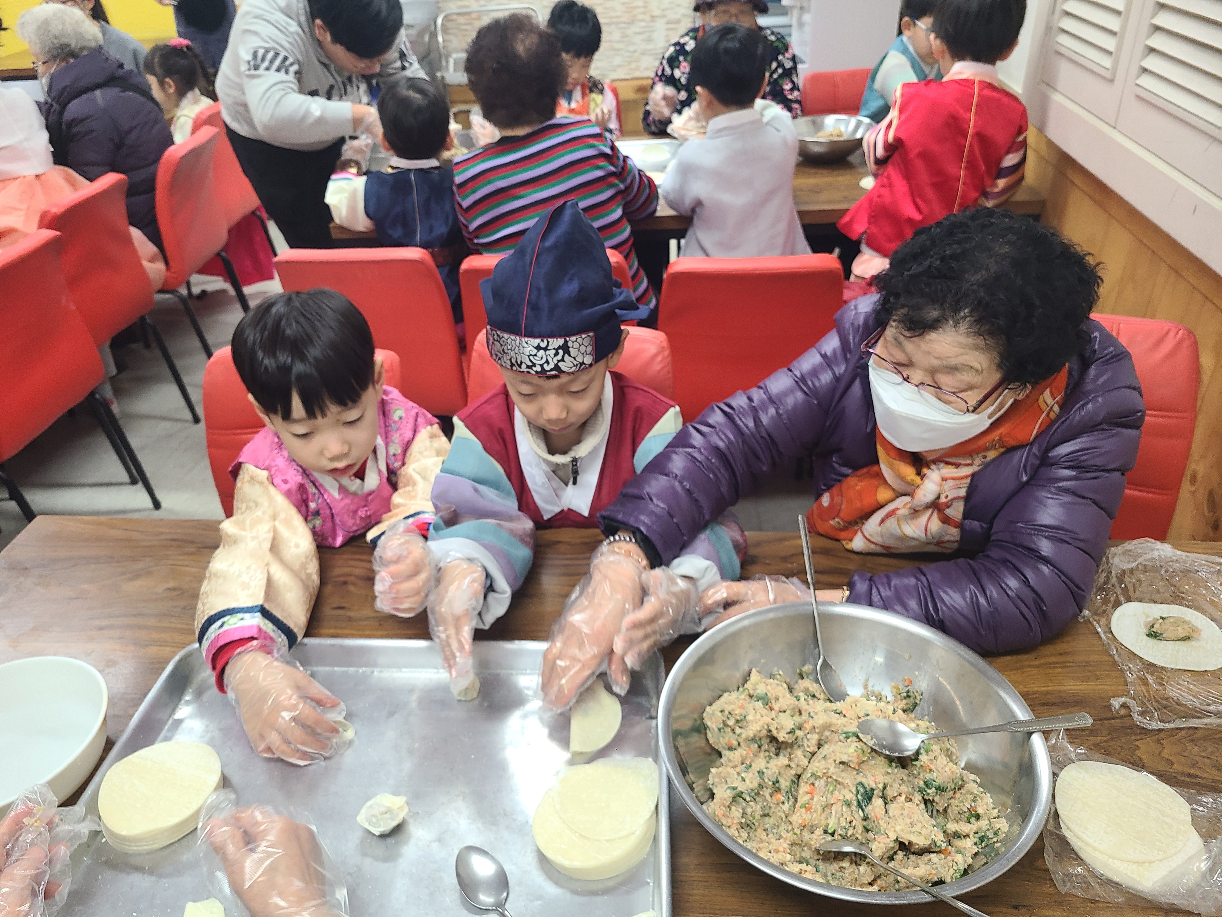 귀여운 아이들과 어르신들께서는 새해인사와 덕담을 나누고, 만두를 함께 빚기위해 경로식당으로 이동하였습니다!
