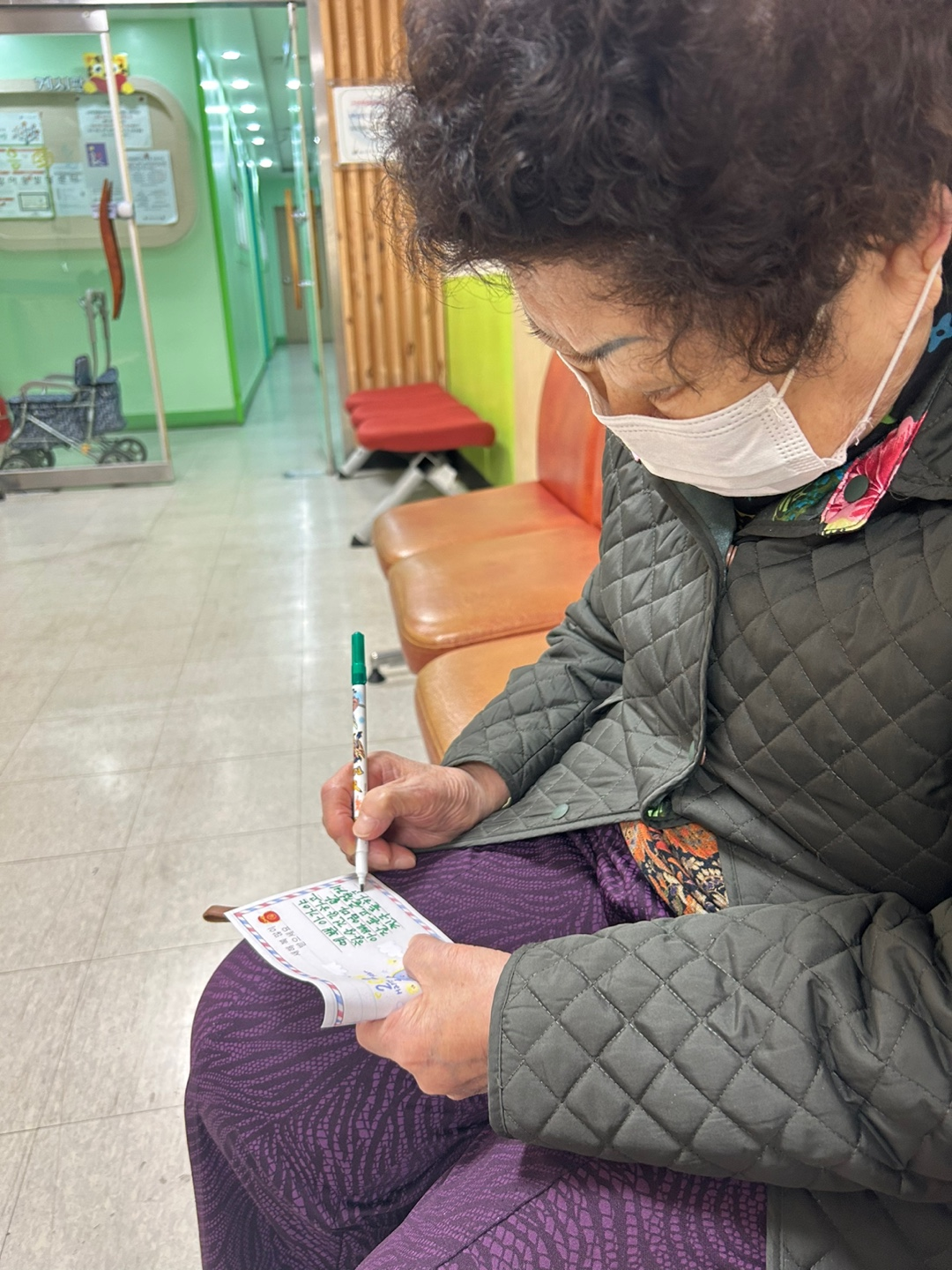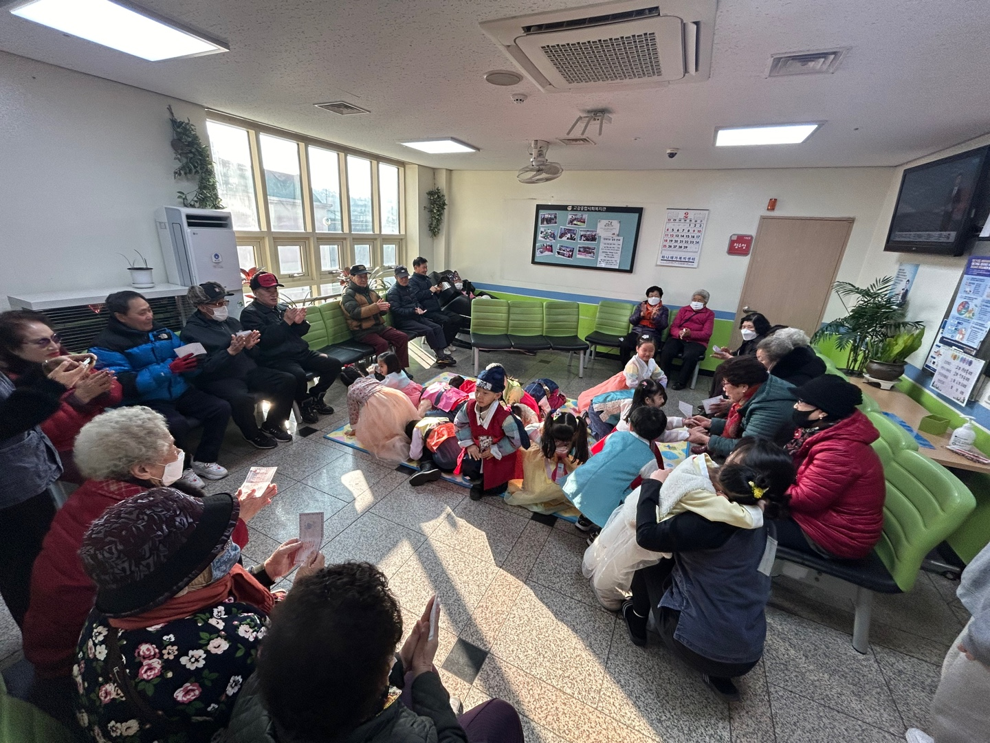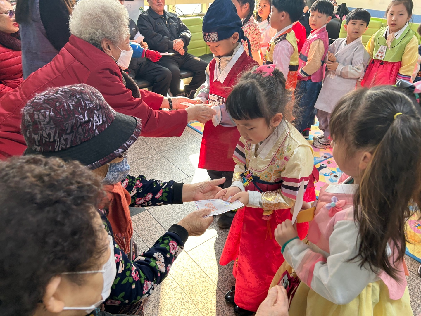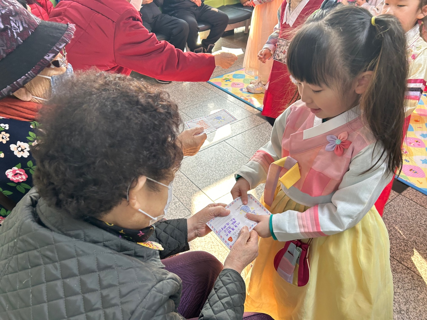 2층 어린이집의 아이들이 고운 한복을 입고 경로식당 어르신들께 새해인사와 세배를 드리러 왔습니다. 어르신들께서는 사전에 세뱃돈 대신 줄 덕담카드를 작성하셨습니다^^