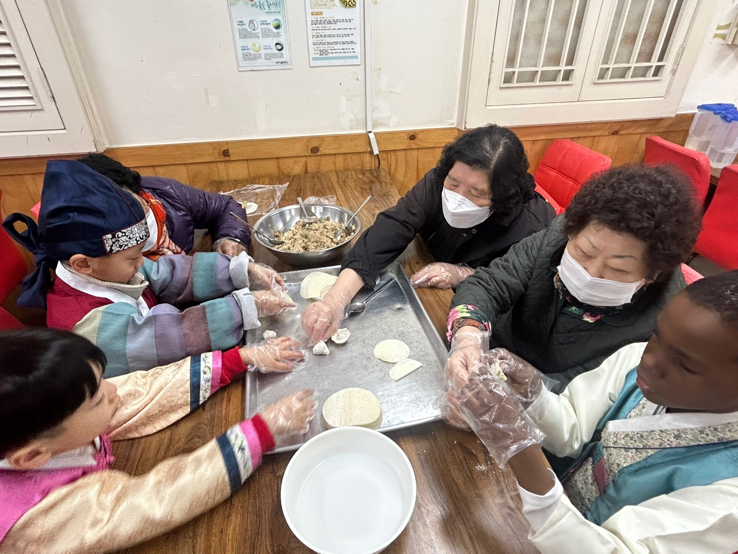 아이들과 어르신이 한테이블에 짝궁이 되어 앉아 만두빚는 법에 대해 배우고, 개성있는 손만두를 만들었습니다!