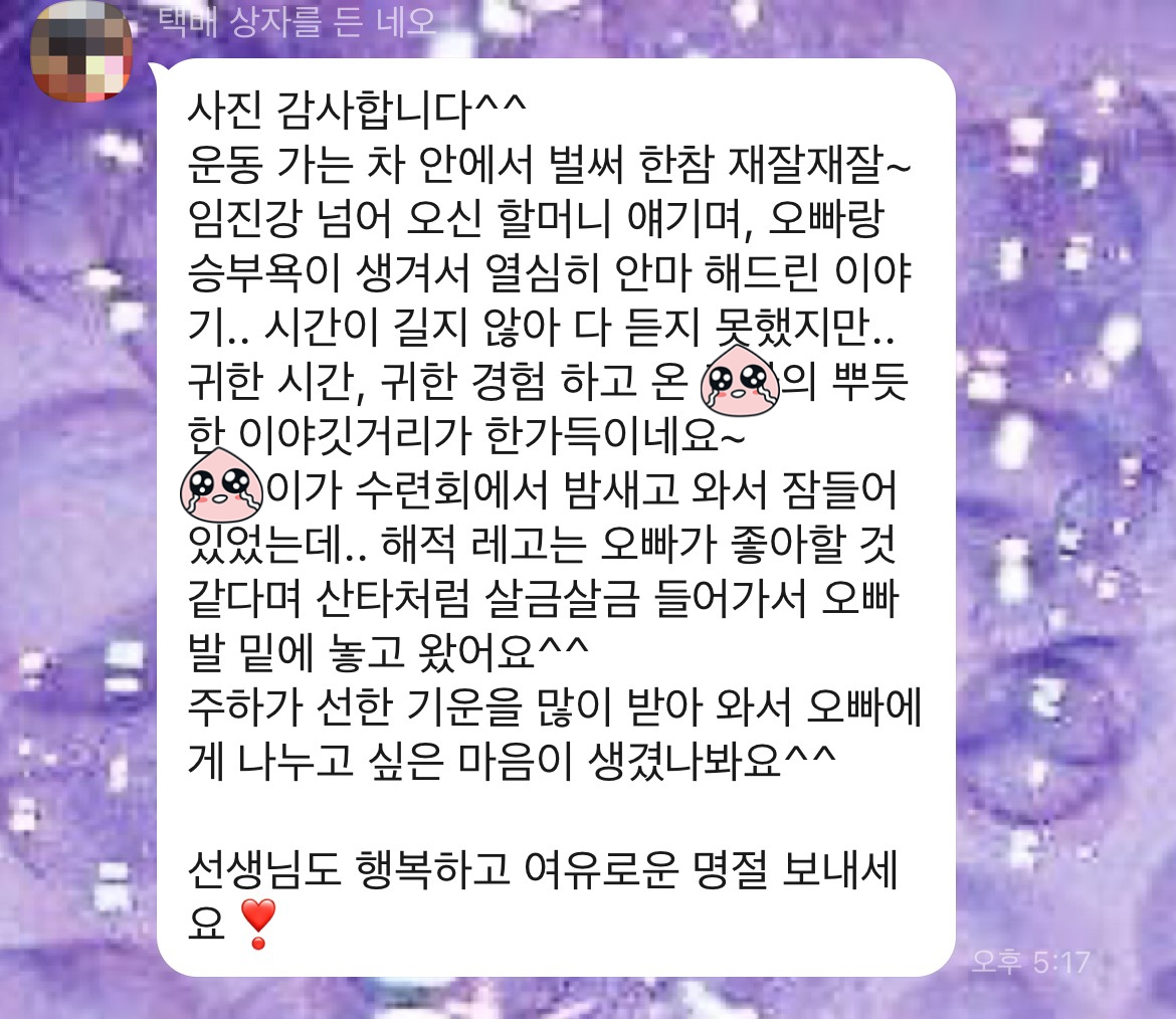 명절 인사 후 아동의 부모님께서 전해주신 후기입니다.