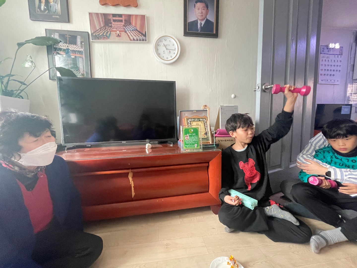 준비한 선물을 전해드리고, 어르신께서도 아이들에게 세뱃돈 대신 준비한 선물을 전해주셨습니다.
