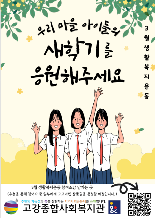 3월 생활복지운동은 우리 마을 아이들의 새학기가 걱정이 아닌 설렘으로 가득하길 바라는 마음으로 준비했습니다. 생활복지운동 홍보지를 접한 가족과 이웃들이 우리 마을 아이들을 수시로 응원해주면 그럴 수 있을 것 같습니다.